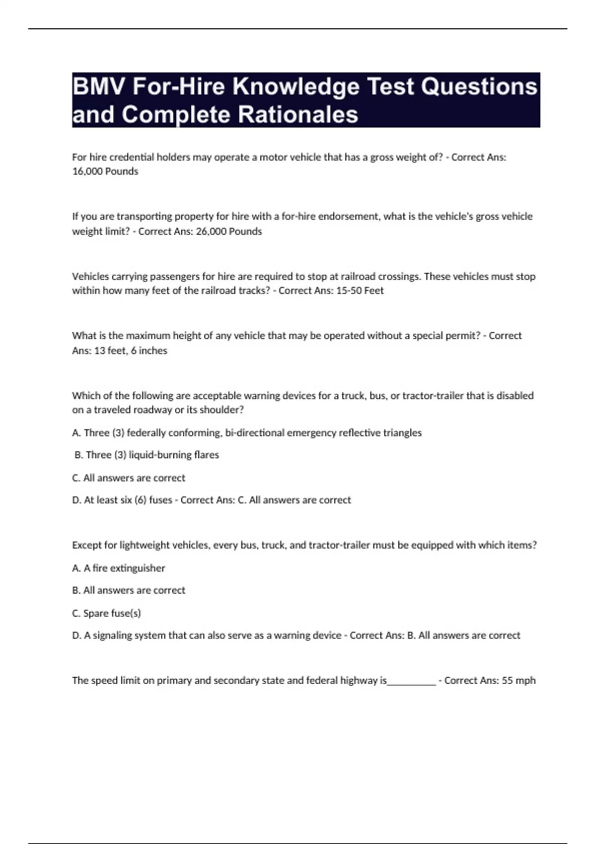 BMV For-Hire Knowledge Test Questions and Complete Rationales