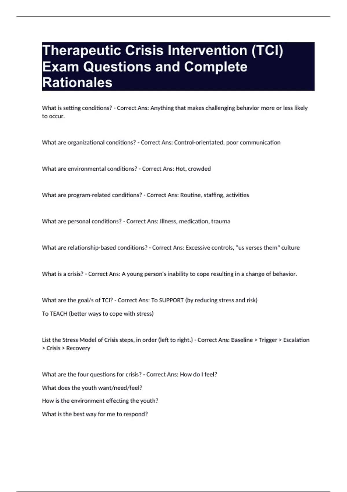 Therapeutic Crisis Intervention (TCI) Exam Questions and Complete Rationales