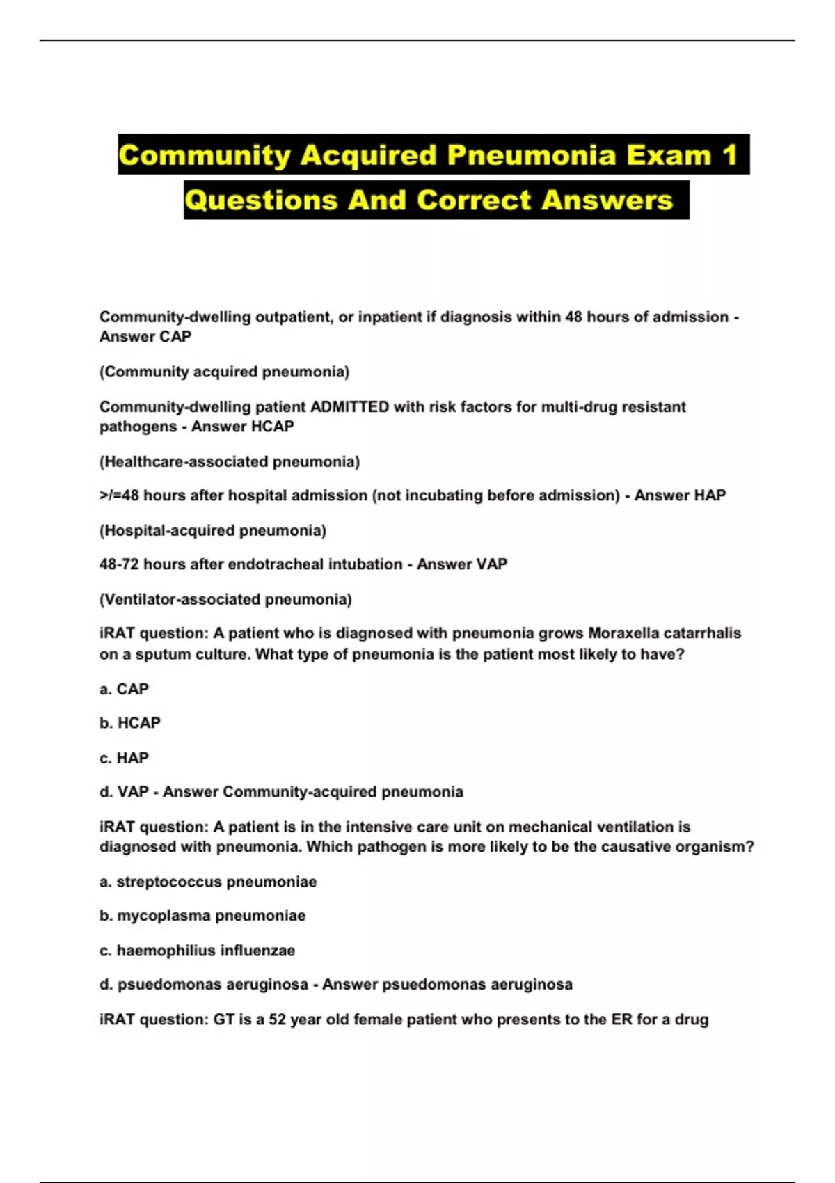 Community Acquired Pneumonia Exam 1 Questions And Correct Answers