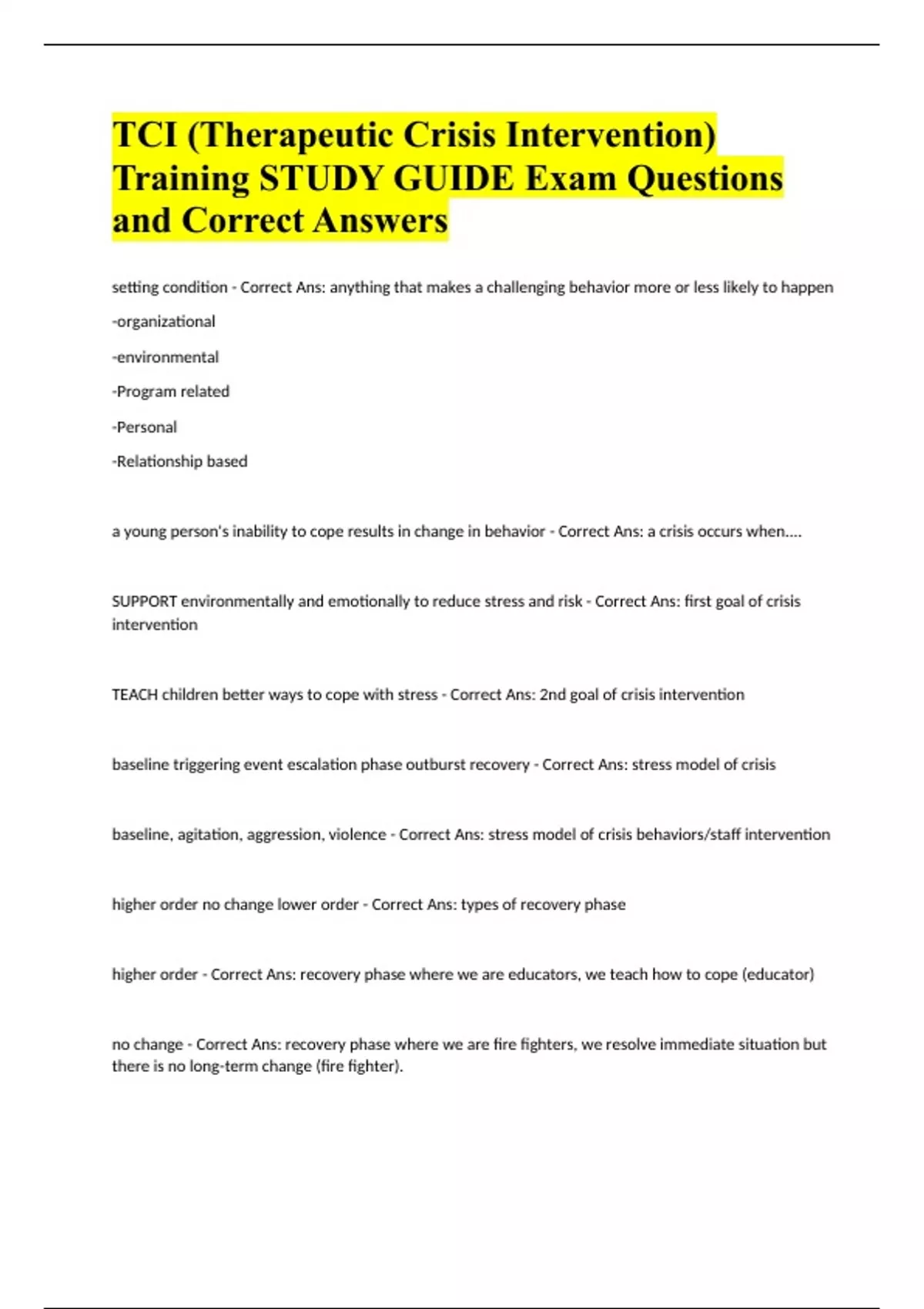 TCI (Therapeutic Crisis Intervention) Training STUDY GUIDE Exam Questions and Correct Answers