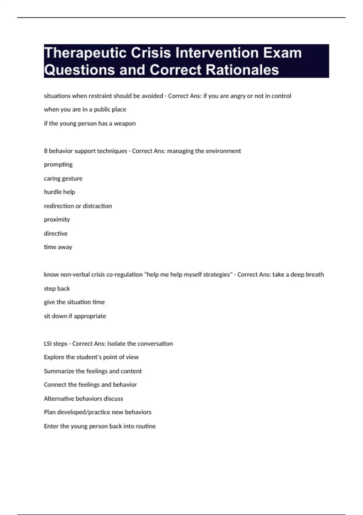 Therapeutic Crisis Intervention Exam Questions and Correct Rationales