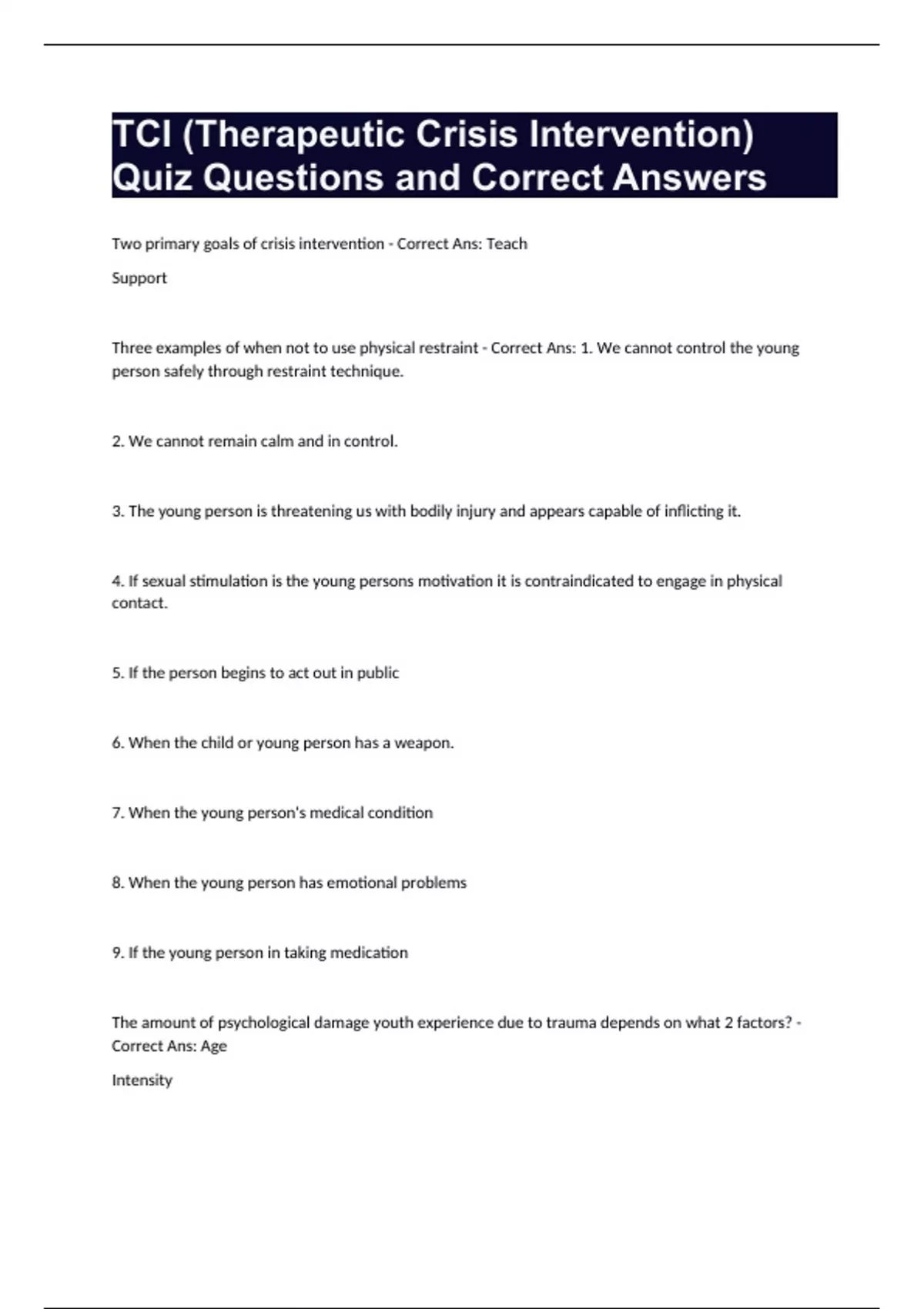 TCI (Therapeutic Crisis Intervention) Quiz Questions and Correct Answers