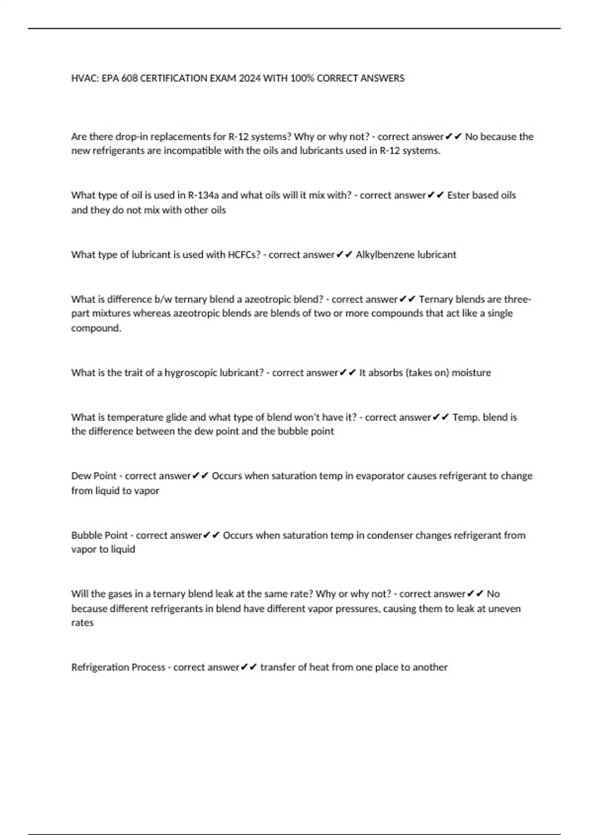 HVAC: EPA 608 CERTIFICATION EXAM 2024 WITH 100% CORRECT ANSWERS Are there drop-in replacements for R-12 systems? Why or why not? - correct answer No because the new refrigerants are incompatible with the oils and lubricants used in R-12 systems. What type of oil is used in R-134a and what oils will it mix with? - correct answer Ester based oils and they do not mix with other oils What type of lubricant is used with HCFCs? - correct answer Alkylbenzene lubricant What is difference b/w ternary blend a azeotropic blend? - correct answer Ternary blends are three-part mixtures whereas azeotropic blends are blends of two or more compounds that act like a single compound. What is the trait of a hygroscopic lubricant? - correct answer It absorbs (takes on) moisture What is temperature glide and what type of blend won't have it? - correct answer Temp. blend is the difference between the dew point and the bubble point Dew Point - correct answer Occurs when saturation temp in evaporator causes refrigerant to change from liquid to vapor