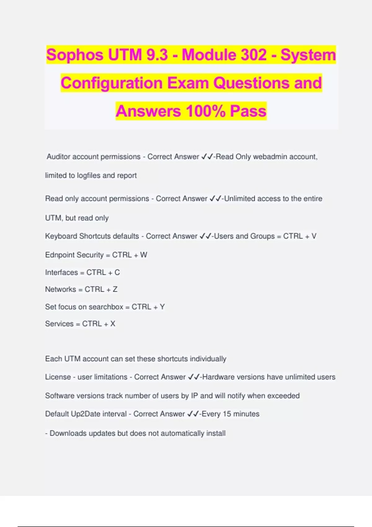 Sophos UTM 9.3 - Module 302 - System Configuration Exam Questions and Answers 100% Pass Auditor account permissions - Correct Answer ️️ -Read Only webadmin account, limited to logfiles and report Read only account permissions - Correct Answer ️️ -Unlimited access to the entire UTM, but read only Keyboard Shortcuts defaults - Correct Answer ️️ -Users and Groups = CTRL + V Ednpoint Security = CTRL + W Interfaces = CTRL + C Networks = CTRL + Z Set focus on searchbox = CTRL + Y Services = CTRL + X Each UTM account can set these shortcuts individually License - user limitations - Correct Answer ️️ -Hardware versions have unlimited users Software versions track number of users by IP and will notify when exceeded Default Up2Date interval - Correct Answer ️️ -Every 15 minutes - Downloads updates but does not automatically install Options for importing backup files - Correct Answer ️️ -- Directly via WebAdmin - During initial setup - From USB (Does NOT support encrypted backups) Automatic backup default - Correct Answer ️️ -Taken weekly Keeps 10 backups Sent to admin email Can optionally be encrypted (Not by default) Definitions can be created for - Correct Answer ️️ -Networks