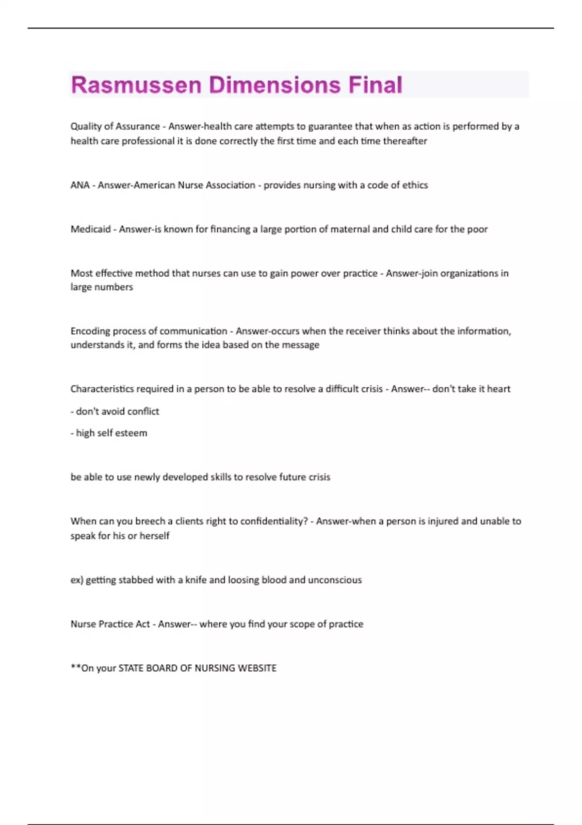 Quality of Assurance - Answer-health care attempts to guarantee that when as action is performed by a health care professional it is done correctly the first time and each time thereafter ANA - Answer-American Nurse Association - provides nursing with a code of ethics Medicaid - Answer-is known for financing a large portion of maternal and child care for the poor Most effective method that nurses can use to gain power over practice - Answer-join organizations in large numbers Encoding process of communication - Answer-occurs when the receiver thinks about the information, understands it, and forms the idea based on the message Characteristics required in a person to be able to resolve a difficult crisis - Answer-- don't take it heart - don't avoid conflict - high self esteem be able to use newly developed skills to resolve future crisis When can you breech a clients right to confidentiality? - Answer-when a person is injured and unable to speak for his or herself ex) getting stabbed with a knife and loosing blood and unconscious Nurse Practice Act - Answer-- where you find your scope of practice **On your STATE BOARD OF NURSING WEBSITETertiary Intervention - Answer-injury has occurred and been treated - prevention from disease or recovery treatment ex) attending cardiac rehab after a heart attack is an example of tertiary care Problem list for a client - Answer-is a phase of nursing diagnosis MD write a DNR order - Answer-Any one can overturn this. The family next of kin can change this order Phase of nursing process: What does it look like? - Answer-Identify short and long term outcomes for the client The good in ethical codes? - Answer-provides framework for decision making (helps with the process of making something) 4 concepts of nursing theory? - Answer-1. Client 2. Health 3. Environment 4. Nursing