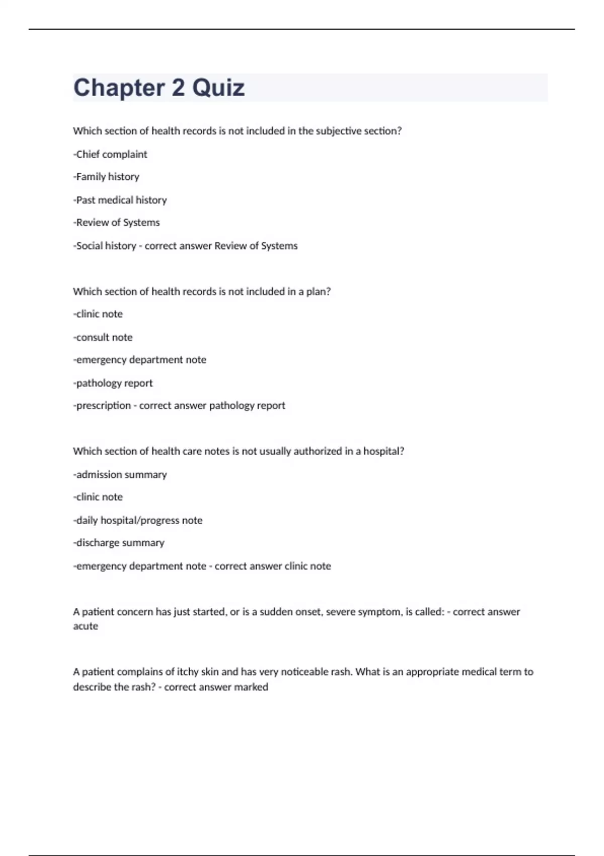Chapter 2 Quiz Correctly Answered 2024. Which section of health records is not included in the subjective section? -Chief complaint -Family history -Past medical history -Review of Systems -Social history - correct answer Review of Systems Which section of health records is not included in a plan? -clinic note -consult note -emergency department note -pathology report -prescription - correct answer pathology report Which section of health care notes is not usually authorized in a hospital? -admission summary -clinic note -daily hospital/progress note -discharge summary -emergency department note - correct answer clinic note A patient concern has just started, or is a sudden onset, severe symptom, is called: - correct answer acute
