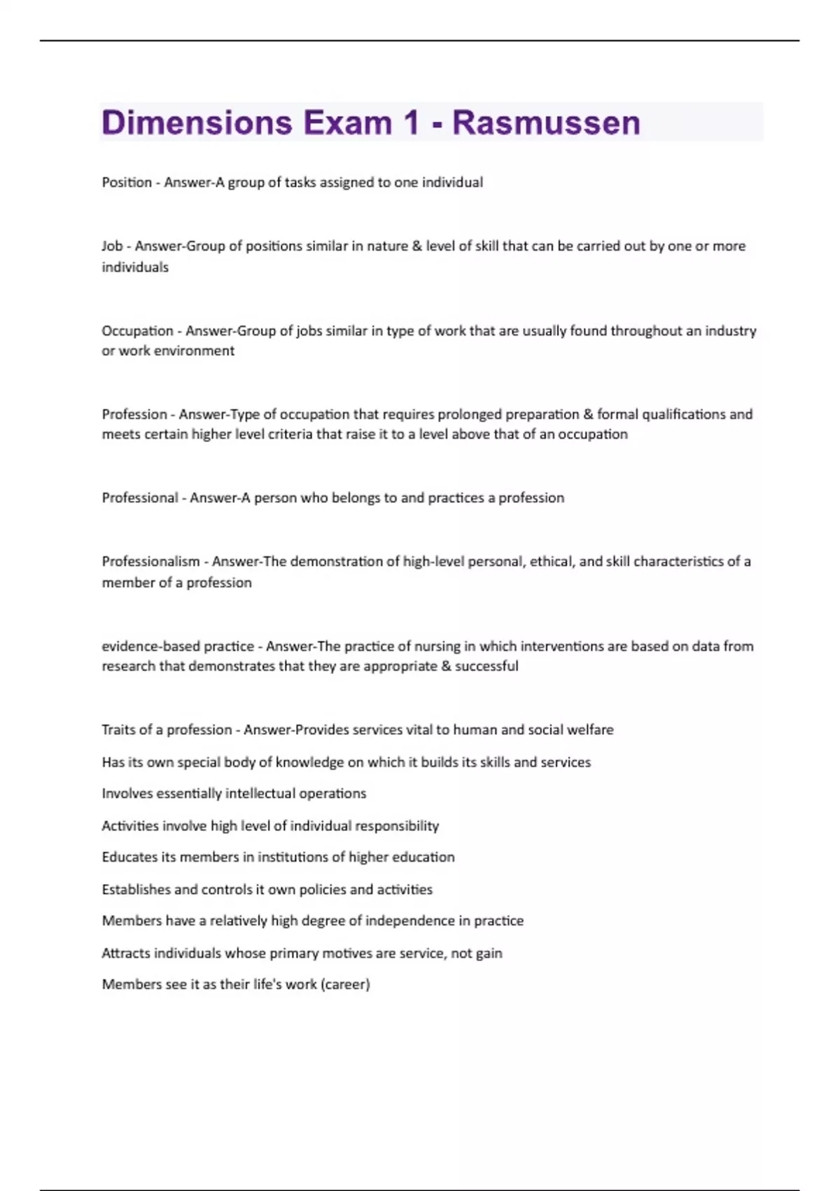 Position - Answer-A group of tasks assigned to one individual Job - Answer-Group of positions similar in nature & level of skill that can be carried out by one or more individuals Occupation - Answer-Group of jobs similar in type of work that are usually found throughout an industry or work environment Profession - Answer-Type of occupation that requires prolonged preparation & formal qualifications and meets certain higher level criteria that raise it to a level above that of an occupation Professional - Answer-A person who belongs to and practices a profession Professionalism - Answer-The demonstration of high-level personal, ethical, and skill characteristics of a member of a profession evidence-based practice - Answer-The practice of nursing in which interventions are based on data from research that demonstrates that they are appropriate & successful Traits of a profession - Answer-Provides services vital to human and social welfare Has its own special body of knowledge on which it builds its skills and services Involves essentially intellectual operations Activities involve high level of individual responsibility Educates its members in institutions of higher education Establishes and controls it own policies and activities Members have a relatively high degree of independence in practice Attracts individuals whose primary motives are service, not gain Members see it as their life's work (career)Has a code organization that fosters & insures quality of practice Practitioners must be able to demonstrate competency in order to practice Requires licensure to protect the public Stand out features of Profession - Answer-Process approach, power approach and trait approach Comparisons of Nursing to other professions - Answer-Members have a relatively high degree of independence in practice Members see it as their life's work or career The public still does not see nursing as a profession Main method in which nurses can gain power in nursing - Answer-Gain experience Learn how to work with higher levels of government Run for office Influence important policies View nursing as a profession and career, not just a job Participate in establishing professional standards Demonstrate continuing competency Become actively involved in patient's rights issues Education, education, education Establish a nurse support network Civility - Answer-Having good manners and being polite Respecting others Based on recognizing that all human beings are important Protection from discrimination Civility in nursing - Answer-The basis for caring Promotes emotional healthCreates a positive environment for learning and the promotion of healing Develops emotional intelligence in nurses Transforms negative attitudes Incivility - Answer-Any type of speech or behavior that disrupts the harmony of the home, work or educational environment Cyber-harassment, vicious anonymous e-mails, hate text messaging, acts of rudeness, social rejection, bullying. Bullying - Answer-Any behavior that could be reasonably be considered humiliating, intimidating, threatening, or demeaning to an individual or group of individuals Can occur anywhere Can become habitual, being repeated over and over A complex concept that includes physical, emotional, verbal abuse, or a combination of all three