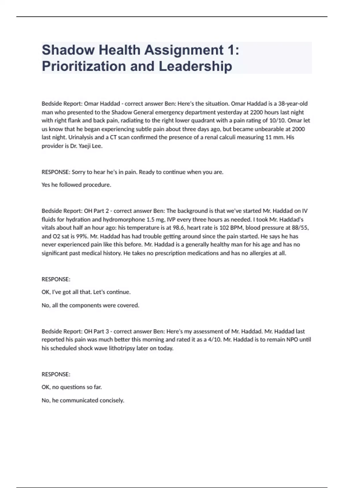 Shadow Health Assignment 1 Prioritization And Leadership Exam Questions Correctly Answered 2024.Bedside Report: Omar Haddad - correct answer Ben: Here's the situation. Omar Haddad is a 38-year-old man who presented to the Shadow General emergency department yesterday at 2200 hours last night with right flank and back pain, radiating to the right lower quadrant with a pain rating of 10/10. Omar let us know that he began experiencing subtle pain about three days ago, but became unbearable at 2000 last night. Urinalysis and a CT scan confirmed the presence of a renal calculi measuring 11 mm. His provider is Dr. Yaeji Lee. RESPONSE: Sorry to hear he's in pain. Ready to continue when you are. Yes he followed procedure. Bedside Report: OH Part 2 - correct answer Ben: The background is that we've started Mr. Haddad on IV fluids for hydration and hydromorphone 1.5 mg, IVP every three hours as needed. I took Mr. Haddad's vitals about half an hour ago: his temperature is at 98.6, heart rate is 102 BPM, blood pressure at 88/55, and O2 sat is 99%. Mr. Haddad has had trouble getting around since the pain started. He says he has never experienced pain like this before. Mr. Haddad is a generally healthy man for his age and has no significant past medical history. He takes no prescription medications and has no allergies at all. RESPONSE: OK, I've got all that. Let's continue. No, all the components were covered. Bedside Report: OH Part 3 - correct answer Ben: Here's my assessment of Mr. Haddad. Mr. Haddad last reported his pain was much better this morning and rated it as a 4/10. Mr. Haddad is to remain NPO until his scheduled shock wave lithotripsy later on today. RESPONSE: OK, no questions so far. No, he communicated concisely.