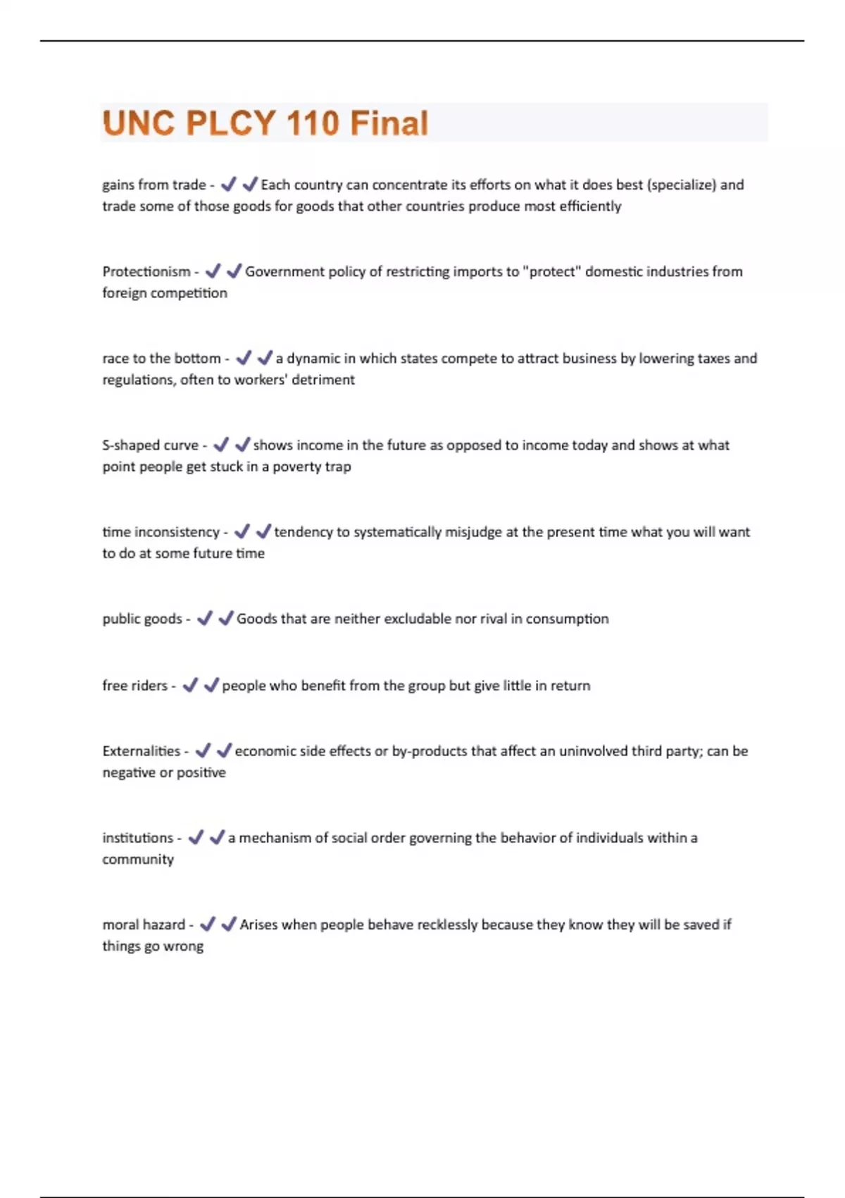 gains from trade - Each country can concentrate its efforts on what it does best (specialize) and trade some of those goods for goods that other countries produce most efficiently Protectionism - Government policy of restricting imports to "protect" domestic industries from foreign competition race to the bottom - a dynamic in which states compete to attract business by lowering taxes and regulations, often to workers' detriment S-shaped curve - shows income in the future as opposed to income today and shows at what point people get stuck in a poverty trap time inconsistency - tendency to systematically misjudge at the present time what you will want to do at some future time public goods - Goods that are neither excludable nor rival in consumption free riders - people who benefit from the group but give little in return Externalities - economic side effects or by-products that affect an uninvolved third party; can be negative or positive institutions - a mechanism of social order governing the behavior of individuals within a community moral hazard - Arises when people behave recklessly because they know they will be saved if things go wrongAdverse Selection - the situation in which one party to a transaction takes advantage of knowing more than the other party to the transaction fraud - A deliberate deception intended to secure an unfair or unlawful gain cash transfers - direct payments of money to eligible poor people migrant - traveler who moves from one region or country to another refugee - A person who has been forced to leave their country in order to escape war, persecution, or natural disaster asylum seeker - Someone who has migrated to another country in the hope of being recognized as a refugee internally displaced - someone who is forced to leave his or her home and community but who remains in the same country proscriptive - forbidding or restricting something prescriptive - of or relating to the imposition or enforcement of a rule or method civil rights - the rights of citizens to political and social freedom and equality. welfare rights - right to receive basic goods- education, health care, protection Universalism - Everyone entitled to certain rights without distinctions based on race, sex, language, religion, political opinion, nationality, or other status. All governments can be expected to guarantee these rights for all the people that live under their jurisdiction.Relativism - : Human values vary according to cultural perspectives and the application or promotion of rights will vary by country or region. Governments should be free to choose which rights to provide. CEDAW - Neither traditional, religious or cultural practice nor incompatible domestic laws and policies can justify violations of the Convention