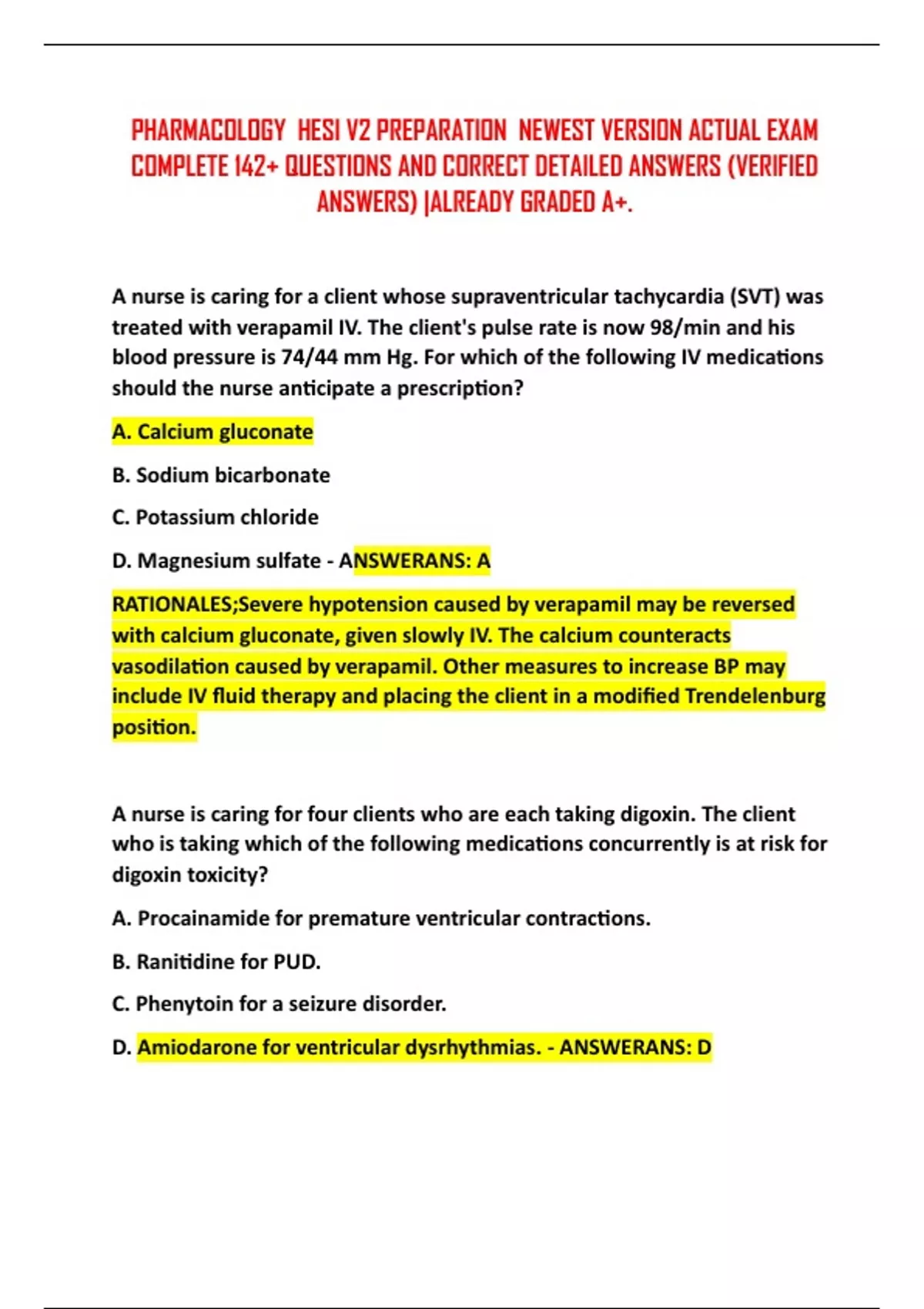 PHARMACOLOGY HESI V2 PREPARATION NEWEST VERSION ACTUAL EXAM COMPLETE 142+ QUESTIONS AND CORRECT DETAILED ANSWERS (VERIFIED ANSWERS) |ALREADY GRADED A+.