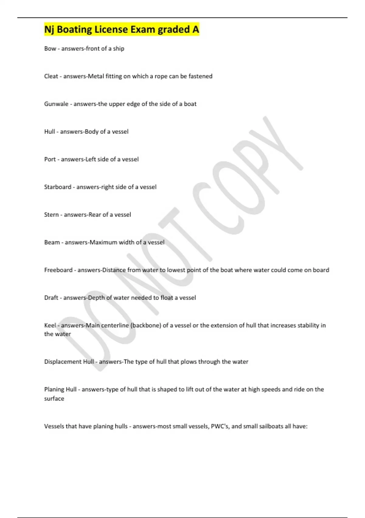Nj Boating License Exam graded A Bow - answers-front of a ship Cleat - answers-Metal fitting on which a rope can be fastened Gunwale - answers-the upper edge of the side of