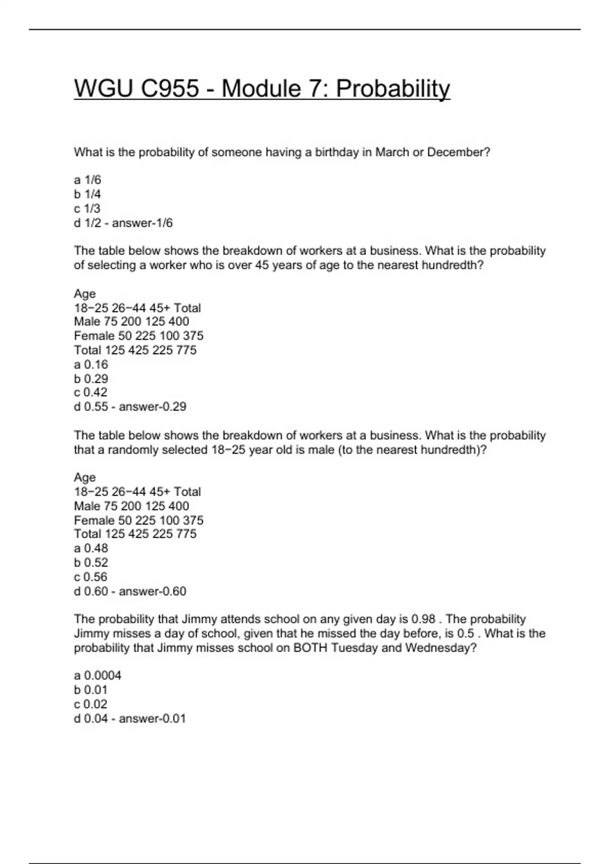 What is the probability of someone having a birthday in March or December? a 1/6 b 1/4 c 1/3 d 1/2 - answer-1/6 The table below shows the breakdown of workers at a business. What is the probability of selecting a worker who is over 45 years of age to the nearest hundredth? Age 18−25 26−44 45+ Total Male Female Total a 0.16 b 0.29 c 0.42 d 0.55 - answer-0.29 The table below shows the breakdown of workers at a business. What is the probability that a randomly selected 18−25 year old is male (to the nearest hundredth)? Age 18−25 26−44 45+ Total Male Female Total a 0.48 b 0.52 c 0.56 d 0.60 - answer-0.60 The probability that Jimmy attends school on any given day is 0.98 . The probability Jimmy misses a day of school, given that he missed the day before, is 0.5 . What is the probability that Jimmy misses school on BOTH Tuesday and Wednesday? a 0.0004 b 0.01 c 0.02 d 0.04 - answer-0.01 The following table shows the percentage of events at an arena. Basketball 26% Hockey 19% Concert 18% Table Tennis 9% Other 28% What is the disjoint probability of having a basketball or hockey game at the arena? a 27% b 37% c 45% d 55 - answer-45% A game has a 10 -sided fair die. What is the probability of rolling an even number or a number less than 5 ? a 1/10 b 3/10 c 7/10 d 9/10 - answer-7/10 A survey on favorite pizza topping was given: 33% said cheese was their favorite topping, 25% said pepperoni, 15% said sausage, and 27% said other. If two people are picked at random and replaced, what is the probability of picking two people that like cheese? Round your answer to a whole number. a 0% b 11% c 33% d 66% - answer-11% There was a marble drawn from a bag in an experiment and placed back in the bag repeatedly. A red marble appeared 45 times, a blue marble 70 times, a green marble 63 times, and a black marble 22 times. What is the empirical probability of the blue marble? a 0.11 b 0.225 c 0.315 d 0.35 - answer-0.35 In a bag, there are 8 red marbles, 10 blue marbles, 9 green marbles, and 5 black marbles. Find the theoretical probability of drawing a red marble out of the bag. a 5/32 b 1/4 c 9/32 d 5/16 - answer-1/4 What is the sample size for choosing an odd number between 1 and 75 , including the numbers 1 and 75 ? a 37 b 38 c 39 d 40 - answer-38 There are black, blue, and white marbles in a bag. The probability of choosing a black marble is 0.36 . The probability of choosing a black and then a white marble is 0.27 . To the nearest hundredth, what is the probability of the second marble being white if the first marble chosen is black? a 0.27 b 0.39 c 0.75