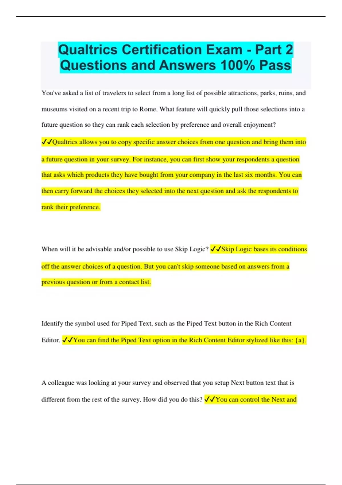 Qualtrics Certification Exam - Part 2 Questions and Answers 100% Pass You've asked a list of travelers to select from a long list of possible attractions, parks, ruins, and museums visited on a recent trip to Rome. What feature will quickly pull those selections into a future question so they can rank each selection by preference and overall enjoyment? Qualtrics allows you to copy specific answer choices from one question and bring them into a future question in your survey. For instance, you can first show your respondents a question that asks which products they have bought from your company in the last six months. You can then carry forward the choices they selected into the next question and ask the respondents to rank their preference. When will it be advisable and/or possible to use Skip Logic? Skip Logic bases its conditions off the answer choices of a question. But you can't skip someone based on answers from a previous question or from a contact list. Identify the symbol used for Piped Text, such as the Piped Text button in the Rich Content Editor. You can find the Piped Text option in the Rich Content Editor stylized like this: {a}. A colleague was looking at your survey and observed that you setup Next button text that is different from the rest of the survey. How did you do this? You can control the Next and Back button text within a given block. Open Block Options. Select Next/Previous Button Text to change the text. True or False: If you pre-populate a default answer choice to a question, and a respondent doesn't change the answer, the default choice will be recorded as the respondent's answer. If a respondent doesn't change the default choice, the default answer will be recorded in your dataset as the respondent's answer. Say you wanted to make a duplicate of a Block. Upon duplicating, you place the duplicated block after the original block (without doing anything else). What will the respondent see? Duplicating a block represents the same set of questions with the answers previously selected pre-populated. When this happens, the respondents are seeing the same exact question twice. When you copy a block instead, the copied questions become "new" questions. What is a block's primary function in a survey? Blocks are used to organize and categorize groups of questions. If you don't customize your Survey Flow in any way, what will respondents see as they exit your survey? The default end of survey