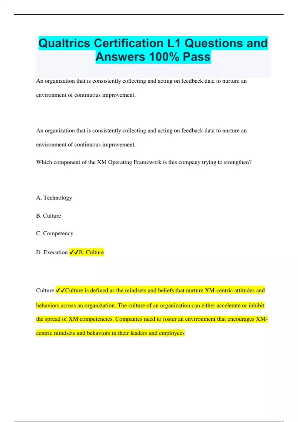 Qualtrics Certification L1 Questions and Answers 100% Pass An organization that is consistently collecting and acting on feedback data to nurture an environment of continuous improvement. An organization that is consistently collecting and acting on feedback data to nurture an environment of continuous improvement. Which component of the XM Operating Framework is this company trying to strengthen? A. Technology B. Culture C. Competency D. Execution B. Culture Culture Culture is defined as the mindsets and beliefs that nurture XM-centric attitudes and behaviors across an organization. The culture of an organization can either accelerate or inhibit the spread of XM competencies. Companies need to foster an environment that encourages XM- centric mindsets and behaviors in their leaders and employees Which of these is NOT a key component of the XM Operating Framework? A. Culture B. Proficiency C. Competency D. Technology B. Proficiency An organization collects data about a future interaction to understand the potential reaction to the interaction. What kind of data is being collected? A. Experience Expectations B. Ad Hoc Diagnostics C. Relationship Attitudes D. Choice Preferences A. Experience Expectations Experience Expectations Experience Expectations is how people think and feel about a future interaction with an organization, which can be collected on a regular cycle or periodically. _____ is a discipline that is used to deliver improved experiences to different stakeholders across an organization to gain competitive advantage. A. Employee Management B. Culture Management C. Customer Management D. Experience Management (XM) D. Experience Management (XM) Experience Management (XM) As a discipline, XM helps organizations deliver differentiated experiences by continuously listening to feedback, propagating insights, and rapidly adapting to change. Which of the following is an example of Experience data (X data?) A. Loyalty Status B. Mobile Number C. Region D. Overall Satisfaction D. Overall Satisfaction X data X data is defined as data that is actively being collected from stakeholders that helps an organization understand experiences. What is an example of a positive insight organizations can gain from Experience Management? A. An organization makes a change after it is suggested by customers B. An organization becomes aware of a strength that they were not aware of and capitalizes on it C. An organization adds new resources that will be beneficial D. All of the above D. All of the above A(n) ____ is a moment of truth that affects the human components of your business. A. Experience B. Gap