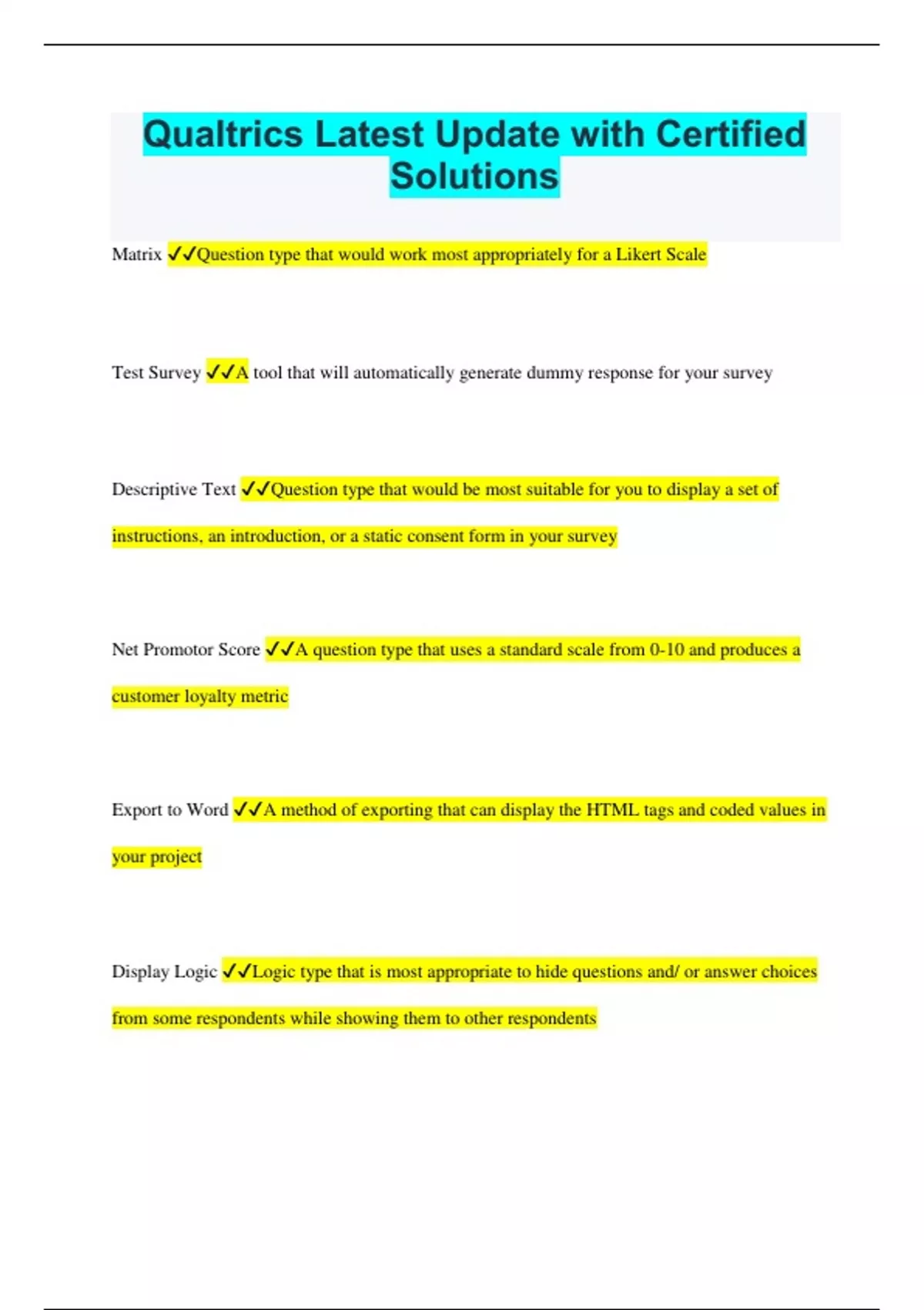 Qualtrics Latest Update with Certified Solutions Matrix Question type that would work most appropriately for a Likert Scale Test Survey A tool that will automatically generate dummy response for your survey Descriptive Text Question type that would be most suitable for you to display a set of instructions, an introduction, or a static consent form in your survey Net Promotor Score A question type that uses a standard scale from 0-10 and produces a customer loyalty metric Export to Word A method of exporting that can display the HTML tags and coded values in your project Display Logic Logic type that is most appropriate to hide questions and/ or answer choices from some respondents while showing them to other respondents Prevent Ballot Box Stuffing Prevents respondents from using anonymous links multiple times. Anonymize Response Removes the IP address from the dataset {a} Symbol used for Piped text Test Survey A tool that will automatically generate dummy responses for your survey Print Survey and QSF (Qualtrics Survey Format) Methods of exporting that maintain the styling of your project Rich Content Editor Qualtrics feature that lets you change the font, size and color of your text PG, PNG, GIF - 16 MB or smaller Image formats and size limits that are supported by Qualtrics CSV Format that is compatible with Microsoft Excel Word Cloud and Paginated Table Examples of custom visualization choices for text entry questions Account Settings followed by User Settings Allows you to change your password or the language in your account Account Settings followed by Account Usage Contact Information for Qualtrics Administration if you have questions about limits of surveys, responses or other user permissions.