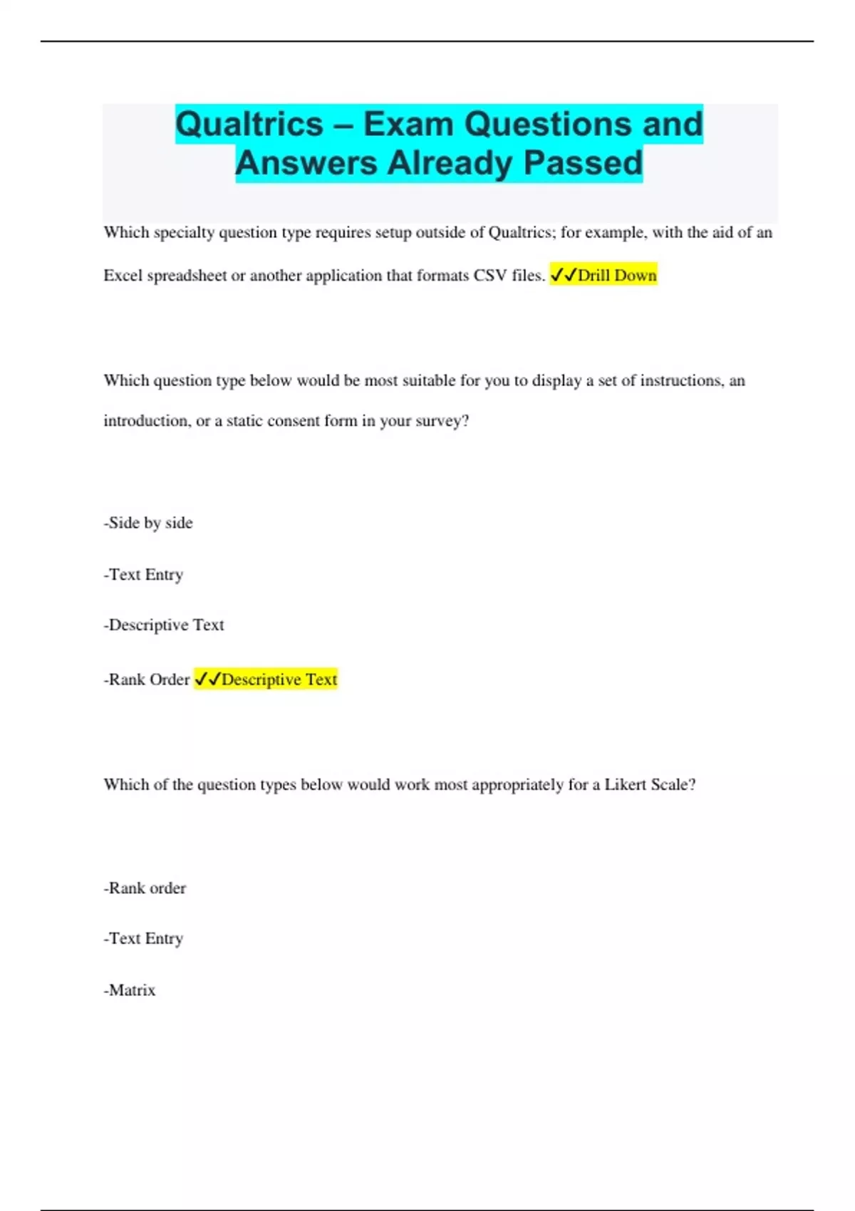 Qualtrics – Exam Questions and Answers Already Passed Which specialty question type requires setup outside of Qualtrics; for example, with the aid of an Excel spreadsheet or another application that formats CSV files. Drill Down Which question type below would be most suitable for you to display a set of instructions, an introduction, or a static consent form in your survey? -Side by side -Text Entry -Descriptive Text -Rank Order Descriptive Text Which of the question types below would work most appropriately for a Likert Scale? -Rank order -Text Entry -Matrix -Constant Sum Matrix A pre-made list that once selected will automatically populate the chosen scale for your question. Automatic Choices Uses a standard scale from 0-10 and produces a customer loyalty metric Net Promoter Score (NPS) To insert a pre-made demographics or satisfaction scale question from the Qualtrics Library, choose Import Questions From, then Select Qualtrics Library, followed by Survey Library. True/False? True You were using Edit Multiple, but after you collected a few responses you noticed it was gone. Why did this happen? You began collecting actual responses What is the best way to import questions from one of your own previously created surveys? Choose the Import Questions From option then choose My Surveys. Then choose the survey you need and select the questions you wish to import into the new survey When will it be advisable and/or possible to use Skip Logic? Select all that apply. 1) To set multiple conditions that need to be triggered to move a respondent to a future question or to a later block 2) To skip a respondent to the end of a survey past a large number of questions 3) To send a respondent back to a previous question 4) To skip a respondent to a subsequent question in the same block 2 & 4 When will it be advisable and/or possible to use Display Logic? Select all that apply. 1) Use display logic when you have a previous condition that came before the current question 2) Use display logic when you have multiple conditions to consider 3) Use display logic when you're jumping past (or hiding) a lot of unnecessary questions based on the current question 1 & 2 Which of the logic types below would be most appropriate to hide questions and/or answer choices from some respondents while showing them to other respondents? -Hide Logic -Branch Logic -Skip Logic -Display Logic Display Logic When building your Display Logic with multiple statements, when should you use OR versus AND? Select all that apply. -Use OR when you want any of two statements to be true -Use OR when you want two or more statements to be true -Use AND when you want two or more statements to be true -Use AND for true statements and OR for false statements