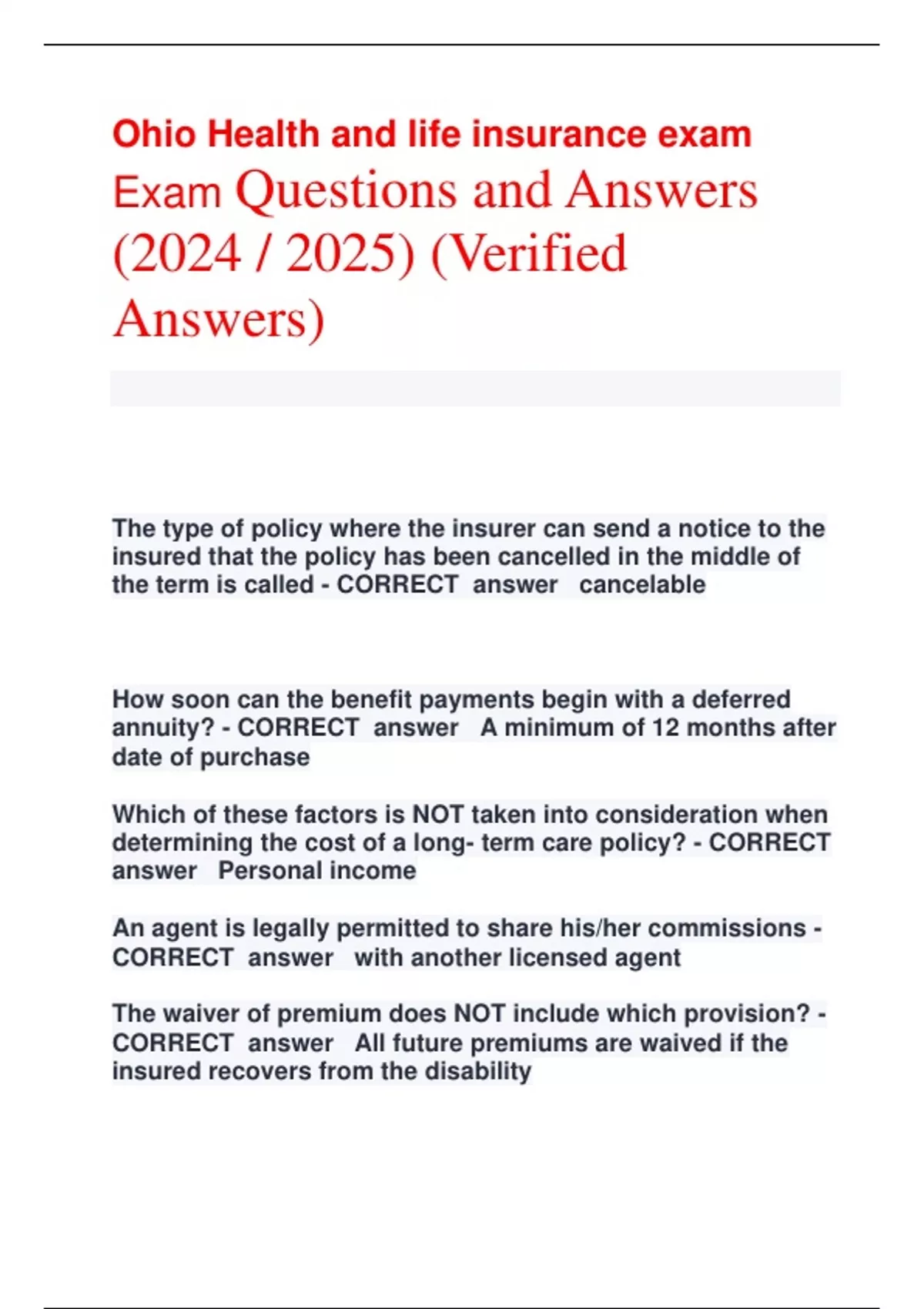 Ohio Health and life insurance exam Exam Questions and Answers (2024 / 2025) (Verified Answers) The type of policy where the insurer can send a notice to the insured that the policy has been cancelled in the middle of the term is called - CORRECT answer cancelable How soon can the benefit payments begin with a deferred annuity? - CORRECT answer A minimum of 12 months after date of purchase Which