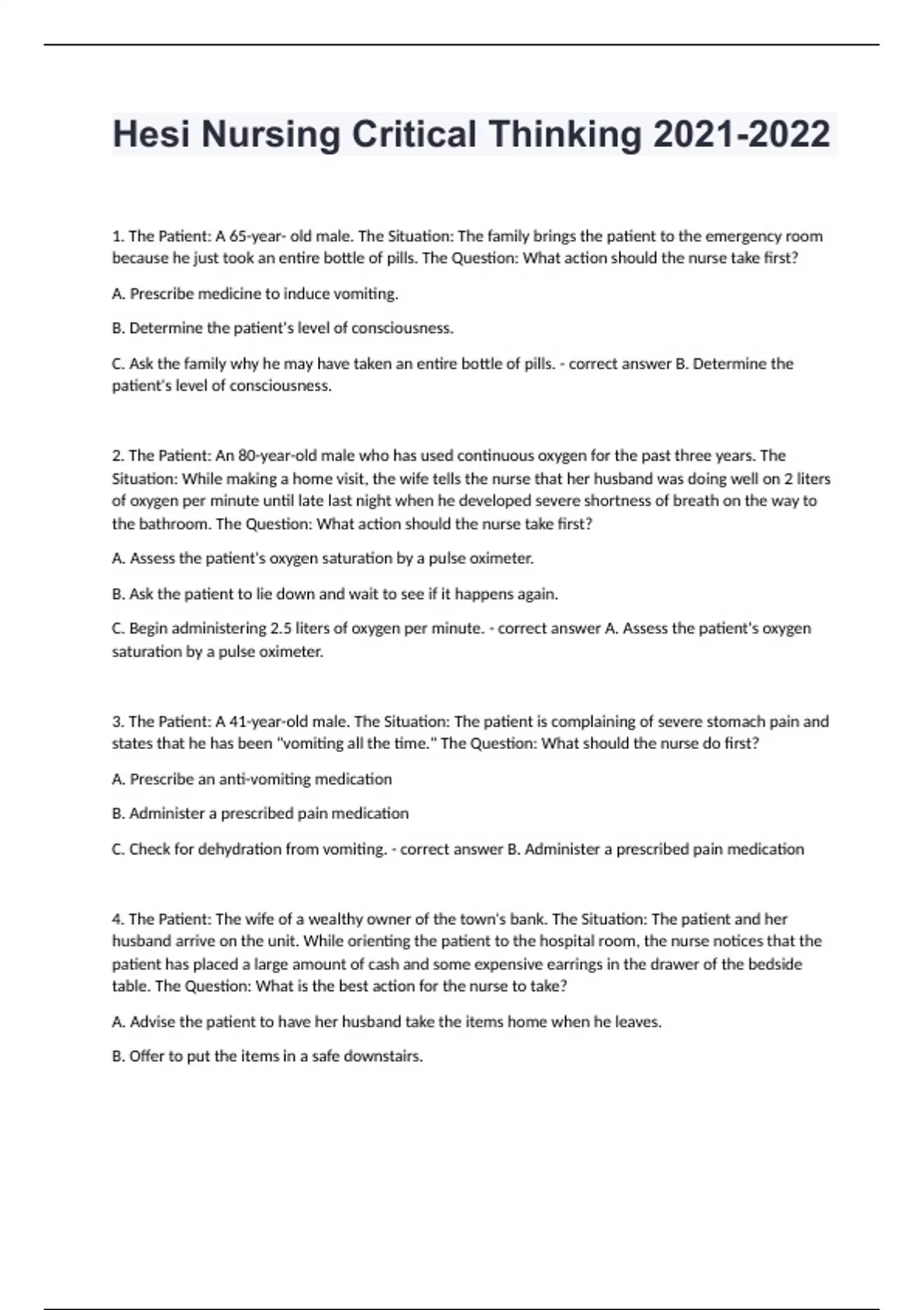 Hesi Nursing Critical Thinking . The Patient: A 65-year- old male. The Situation: The family brings the patient to the emergency room because he just took an entire bottle of pills. The Question: What action should the nurse take first? A. Prescribe medicine to induce vomiting. B. Determine the patient's level of consciousness. C. Ask the family why he may have taken an entire bottle of pills. - correct answer B. Determine the patient's level of consciousness. 2. The Patient: An 80-year-old male who has used continuous oxygen for the past three years. The Situation: While making a home visit, the wife tells the nurse that her husband was doing well on 2 liters of oxygen per minute until late last night when he developed severe shortness of breath on the way to the bathroom. The Question: What action should the nurse take first? A. Assess the patient's oxygen saturation by a pulse oximeter. B. Ask the patient to lie down and wait to see if it happens again. C. Begin administering 2.5 liters of oxygen per minute. - correct answer A. Assess the patient's oxygen saturation by a pulse oximeter. 3. The Patient: A 41-year-old male. The Situation: The patient is complaining of severe stomach pain and states that he has been "vomiting all the time." The Question: What should the nurse do first? A. Prescribe an anti-vomiting medication B. Administer a prescribed pain medication C. Check for dehydration from vomiting. - correct answer B. Administer a prescribed pain medication 4. The Patient: The wife of a wealthy owner of the town's bank. The Situation: The patient and her husband arrive on the unit. While orienting the patient to the hospital room, the nurse notices that the patient has placed a large amount of cash and some expensive earrings in the drawer of the bedside table. The Question: What is the best action for the nurse to take? A. Advise the patient to have her husband take the items home when he leaves. B. Offer to put the items in a safe downstairs.