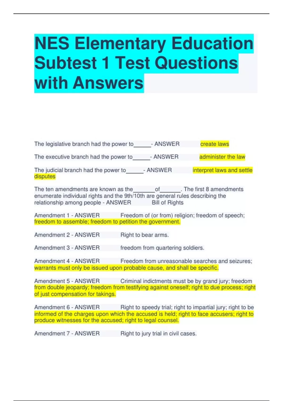 NES Elementary Education Subtest 1 Test Questions with Answers