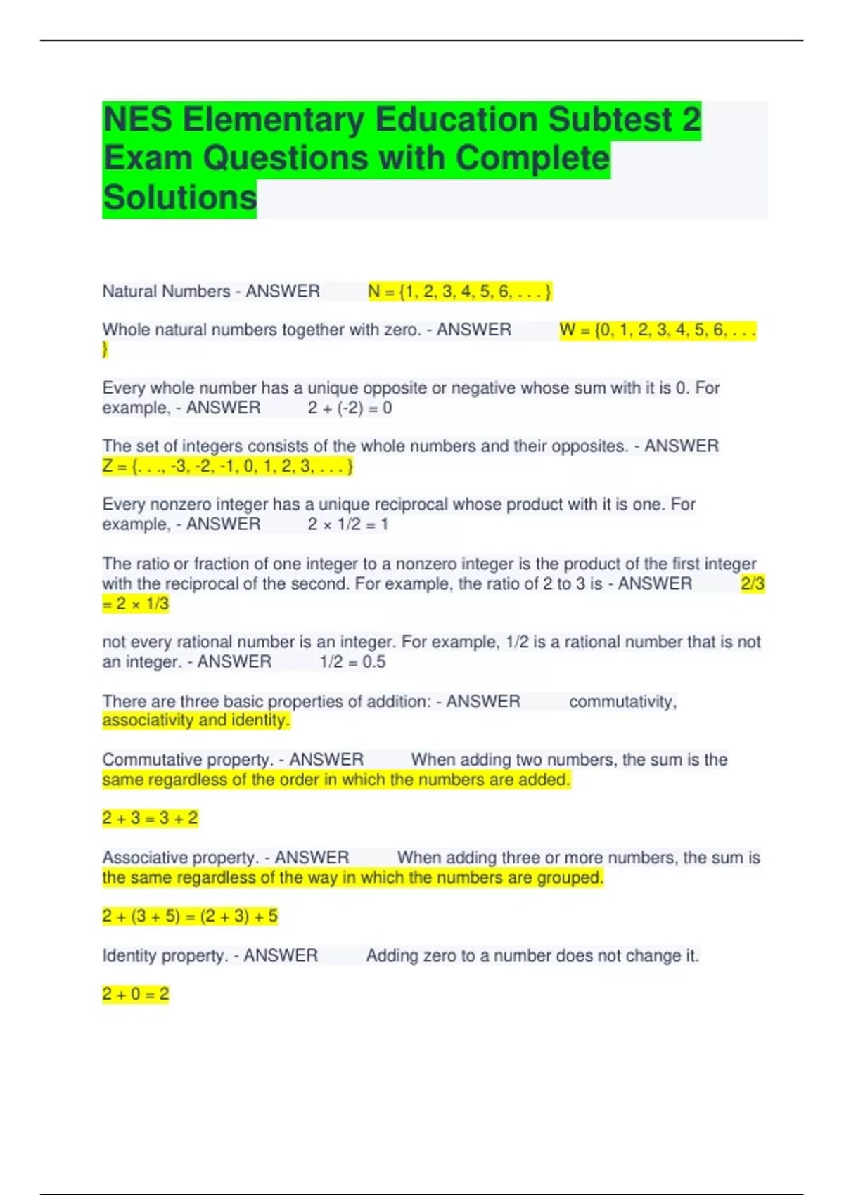 NES Elementary Education Subtest 2 Exam Questions with Complete Solutions Every whole number has a unique opposite or negative whose sum with it is 0. For example, - ANSWER 2 + (-2) = 0 The set of integers consists of the whole numbers and their opposites. - ANSWER Z = {. . ., -3, -2, -1, 0, 1, 2, 3, . . . } Every nonzero integer has a unique reciprocal whose product with it is one. For example, - ANSWER 2 × 1/2 = 1 The ratio or fraction of one integer to a nonzero integer is the product of the first integer with the reciprocal of the second. For example, the ratio of 2 to 3 is - ANSWER 2/3 = 2 × 1/3 not every rational number is an integer. For example, 1/2 is a rational number that is not an integer. - ANSWER 1/2 = 0.5 There are three basic properties of addition: - ANSWER commutativity, associativity and identity. Commutative property. - ANSWER When adding two numbers, the sum is the same regardless of the order in which the numbers are added. 2 + 3 = 3 + 2 Associative property. - ANSWER When adding three or more numbers, the sum is the same regardless of the way in which the numbers are grouped. 2 + (3 + 5) = (2 + 3) + 5 Identity property. - ANSWER Adding zero to a number does not change it. 2 + 0 = 2 associativity and identity. sum of the products of the number with each term of the sum. 2 × (3 + 5) = (2 × 3) + (2 × 5) is often called a power. For example, the third power of 2 is 2³ = 2 × 2 × 2 = 8 We define the zero power of any nonzero number to be 1. For example, - ANSWER (-3)0 = 1 A negative exponent indicates a reciprocal. For example, - ANSWER 2 (-3rd power) =1 / 2 (3rd power) = 1 / 8 The first power of any number is itself. For example, - ANSWER 2 (to the 1st power) = 2 To multiply like bases with exponents, add the exponents. For example, - ANSWER 2 (to the 3rd) x 2 (to the 5th) = 2 (to the eighth) To exponentiate a power, multiply the exponents. For example, - ANSWER (2 to the 3rd) to the 5th = 2 to the 15th 10 to the 0 power - ANSWER 1 10 to the 1 power - ANSWER 10 10 to the -2 power - ANSWER 1 / 10 to the 2 power or 1 / 100 10 to the 2 power x 10 to the 3 power - ANSWER 10 to the 5 power Identifying Place Value in Numbers 2045 - ANSWER 2045 = (2 x 10 to the 3 power) + (0 x 10 to the 2 power) + (4 x 10 to the 1 power) + 5 x 10 to the 0 power) Digits to the right of a decimal point correspond to negative powers of ten. For example, 23.405 - ANSWER 23.405 = (2 x 10 to the 1 power) + (3 x 10 to the 0 power) + (4 x 10 to the -1 power) + (0 x 10 to the -2 power) + (5 x 10 to the -3 power) Converting a fraction to a decimal. For example 3/8 - ANSWER 3 divided by 8 = 0.375 Converting a fraction to a percentage. Convert the fraction to a decimal and then convert the decimal to a percentage. For example, 2/5 - ANSWER 2/5 = .4 = 40%