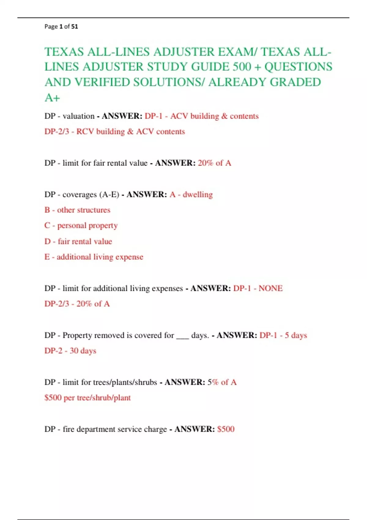 TEXAS ALL-LINES ADJUSTER EXAM/ TEXAS ALLLINES ADJUSTER STUDY GUIDE 500 + QUESTIONS AND VERIFIED SOLUTIONS/ ALREADY GRADED A+