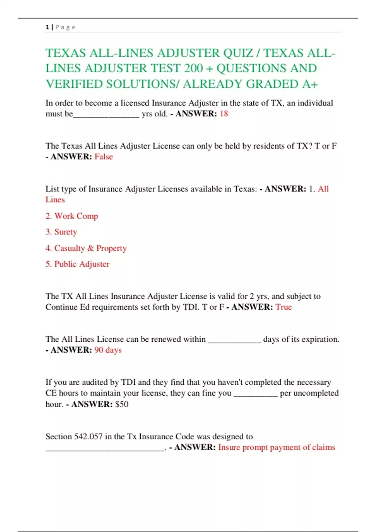 TEXAS ALL-LINES ADJUSTER QUIZ / TEXAS ALLLINES ADJUSTER TEST 200 + QUESTIONS AND VERIFIED SOLUTIONS/ ALREADY GRADED A+