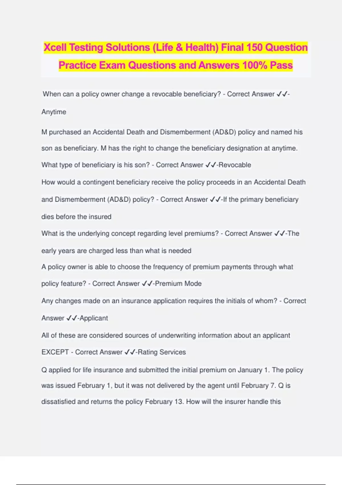 Xcell Testing Solutions (Life & Health) Final 150 Question Practice Exam Questions and Answers 100% Pass When can a policy owner change a revocable beneficiary? - Correct Answer ️️ - Anytime M purchased an Accidental Death and Dismemberment (AD&D) policy and named his son as beneficiary. M has the right to change the beneficiary designation at anytime. What type of beneficiary is his son? - Correct Answer ️️ -Revocable How would a contingent beneficiary receive the policy proceeds in an Accidental Death and Dismemberment (AD&D) policy? - Correct Answer ️️ -If the primary beneficiary dies before the insured What is the underlying concept regarding level premiums? - Correct Answer ️️ -The early years are charged less than what is needed A policy owner is able to choose the frequency of premium payments through what policy feature? - Correct Answer ️️ -Premium Mode Any changes made on an insurance application requires the initials of whom? - Correct Answer ️️ -Applicant All of these are considered sources of underwriting information about an applicant EXCEPT - Correct Answer ️️ -Rating Services Q applied for life insurance and submitted the initial premium on January 1. The policy was issued February 1, but it was not delivered by the agent until February 7. Q is dissatisfied and returns the policy February 13. How will the insurer handle this situation? - Correct Answer ️️ -Policy was returned within the free-look period, premium will be fully refunded M completes an application for life insurance but does not pay the initial premium. All of these actions must occur before M's policy goes into effect EXCEPT - Correct Answer ️️ -free-look period has expired What action should a producer take if the initial premium is NOT submitted with the application? - Correct Answer ️️ -Forward the application to the insurer without the initial premium Which of the following is an important underwriting principle of group life insurance? - Correct Answer ️️ -Everyone must be covered in the group Which requirement must be met for an association to be eligible for a group life plan? - Correct Answer ️️ -Group was formed for a purpose other than acquiring insurance When an employee is terminated, which statement about a group term life conversion is true? - Correct Answer ️️ -Policy proceeds will be paid if the employee dies during the conversion period Under a trustee group life policy, who would be eligible for a certificate of coverage? - Correct Answer ️️ -Corporation N, age 50, recently bought an annuity that will pay a guaranteed $2,000/month at age 70 for life. What type of annuity did N purchase? - Correct Answer ️️ -Fixed Deferred S recently received a $500,000 lump sum retirement buyout from her employer. She would like to buy an annuity that will immediately furnish her with a guaranteed income for life. What type of annuity is best suited for her situation? - Correct Answer ️️ - Single Premium Which of these is an element of a Single Premium annuity? - Correct Answer ️️ - Lump-sum payment Which of these statements concerning an Individual Straight Life annuity is accurate? - Correct Answer ️️ -Payments are made to an annuitant for life An individual who purchases a Life annuity is given protection against - Correct Answer ️️ -the risk of living longer than expected An immediate annuity consists of a - Correct Answer ️️ -single premium All of these are considered to be a benefit under Social Security EXCEPT for - Correct Answer ️️ -unemployment Which product would best serve a retired individual looking to invest a lump-sum of money through an insurance company? - Correct Answer ️️ -Annuity Which statement regarding third-party ownership of a life insurance policy is true? - Correct Answer ️️ -It is used extensively in estate-planning as well as business circumstances Company Z has a Cross Purchase Buy-Sell Agreement in place among its three founding partners. If the agreement is funded with individual life insurance, what would it require? - Correct Answer ️️ -Each partner must own a policy on the other partners Who elects the governing body of a mutual insurance company? - Correct Answer ️️ - policyholders When does a Guaranteed Insurability Rider allow the insured to buy additional coverage? - Correct Answer ️️ -at future dates specified in the contract with no evidence of insurability required S would like to use dividends from her life insurance policy to purchase paid-up additions. All of these would be factors that determine how much coverage can be purchased EXCEPT - Correct Answer ️️ -beneficiary's age M has an insurance policy that also has an outstanding policy loan at the time of M's death. The insurer will deduct the outstanding loan b