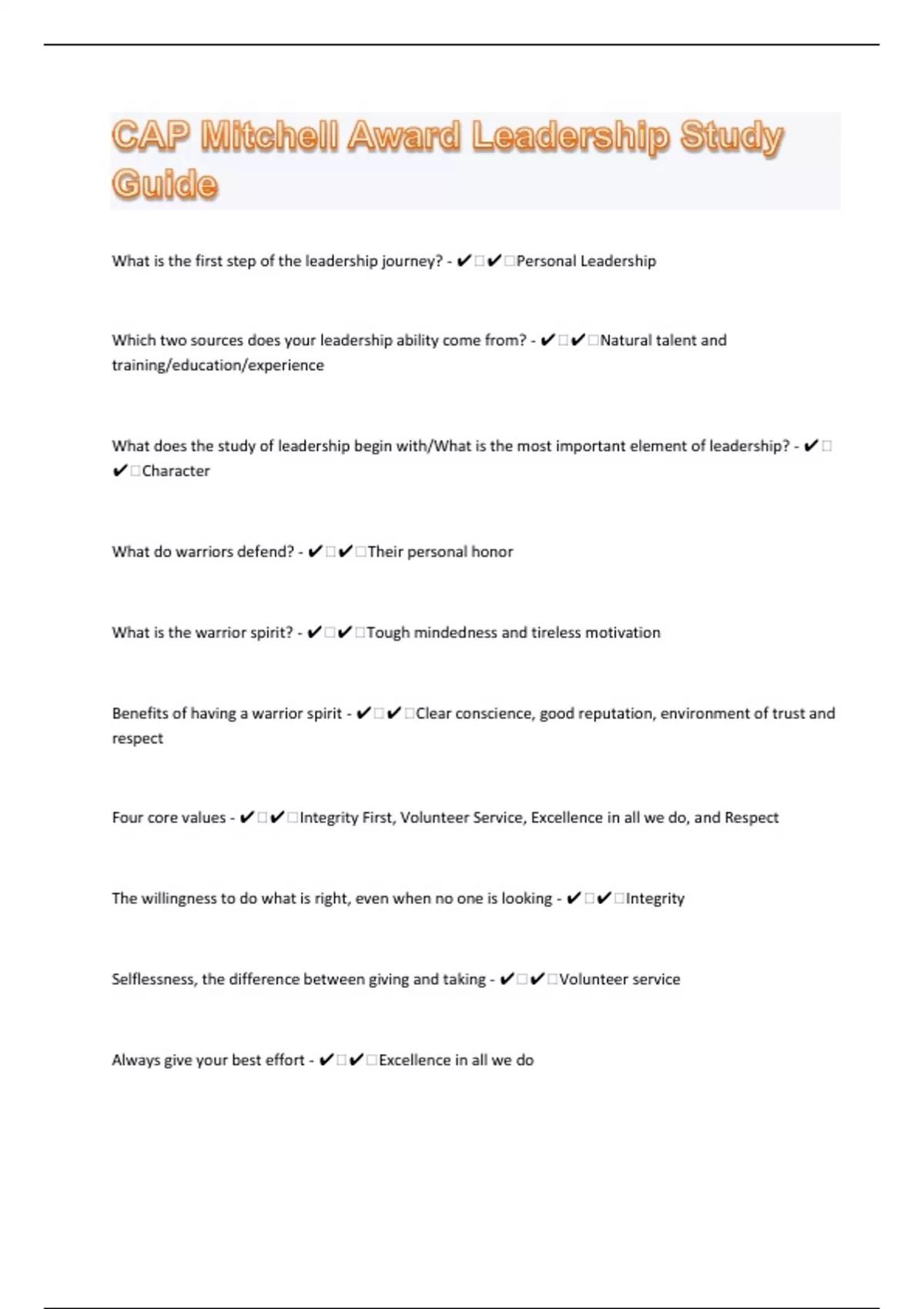 What is the first step of the leadership journey? - ️️Personal Leadership Which two sources does your leadership ability come from? - ️️Natural talent and training/education/experience What does the study of leadership begin with/What is the most important element of leadership? - ️️Character What do warriors defend? - ️️Their personal honor What is the warrior spirit? - ️️Tough mindedness and tireless motivation Benefits of having a warrior spirit - ️️Clear conscience, good reputation, environment of trust and respect Four core values - ️️Integrity First, Volunteer Service, Excellence in all we do, and Respect The willingness to do what is right, even when no one is looking - ️️Integrity Selflessness, the difference between giving and taking - ️️Volunteer service Always give your best effort - ️️Excellence in all we do