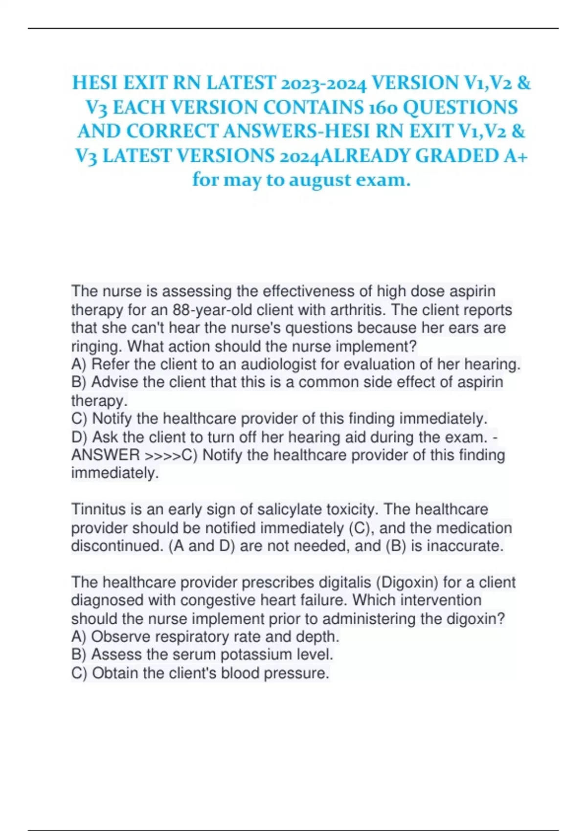 HESI EXIT RN LATEST VERSION V1,V2 & V3 EACH VERSION CONTAINS 160 QUESTIONS AND CORRECT ANSWERS-HESI RN EXIT V1,V2 & V3 LATEST VERSIONS 2024ALREADY GRADED A+for may to august exam