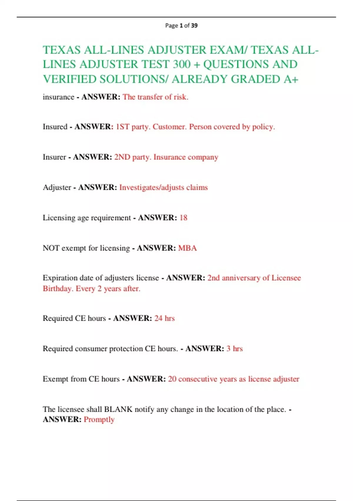 TEXAS ALL-LINES ADJUSTER EXAM/ TEXAS ALLLINES ADJUSTER TEST 300 + QUESTIONS AND VERIFIED SOLUTIONS/ ALREADY GRADED A+
