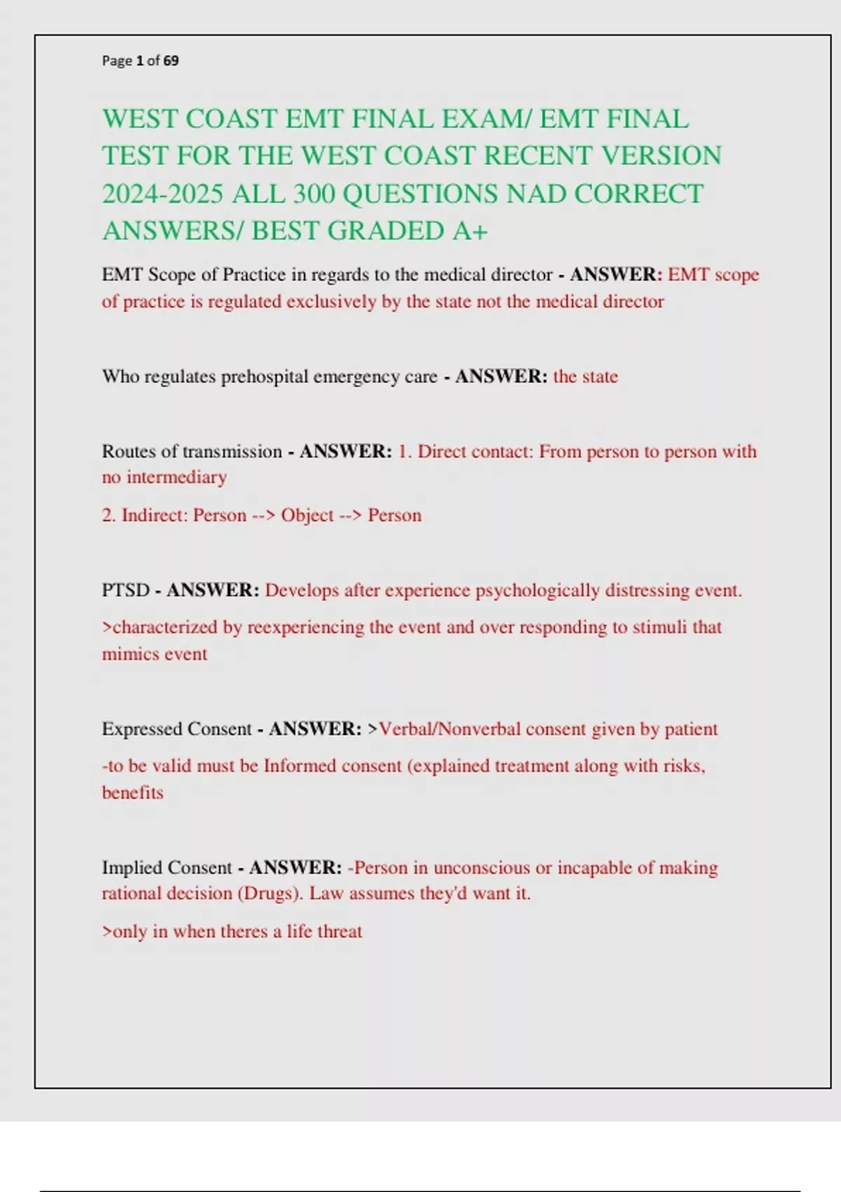 WEST COAST EMT FINAL EXAM/ EMT FINAL TEST FOR THE WEST COAST RECENT VERSION ALL 300 QUESTIONS NAD CORRECT ANSWERS/ BEST GRADED A+