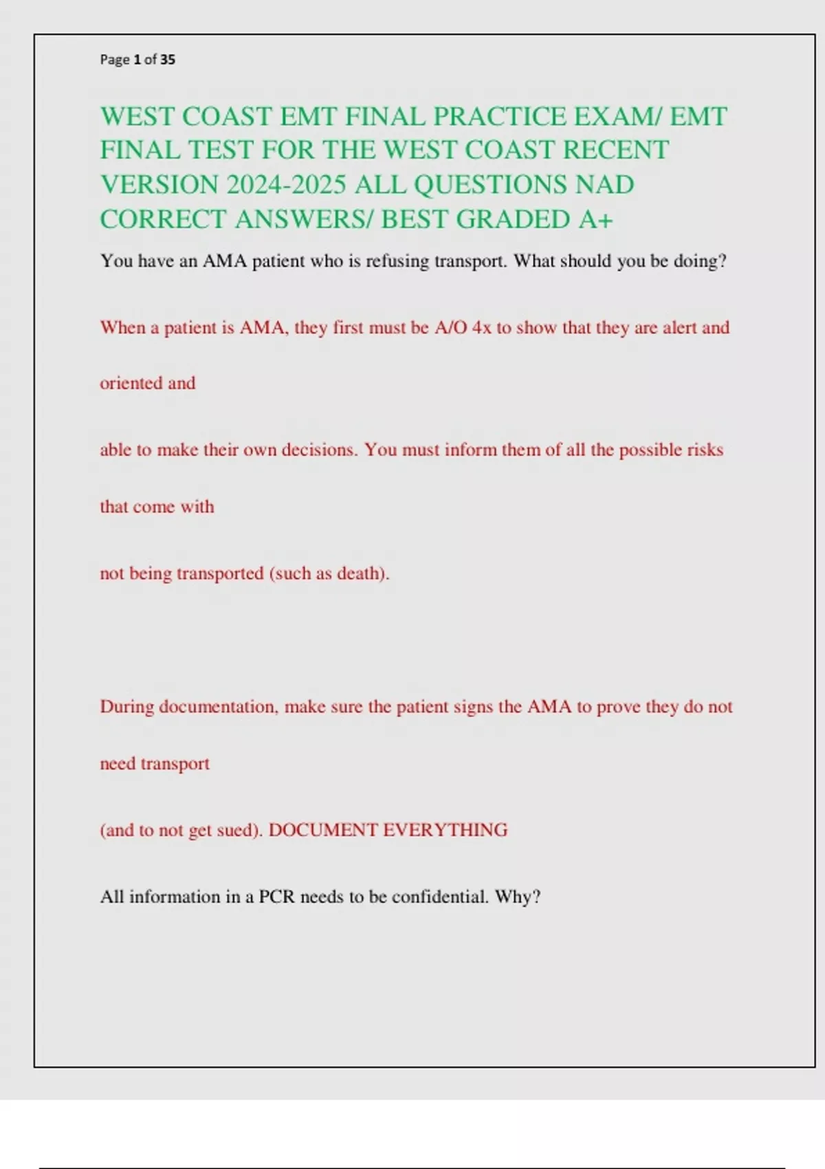 WEST COAST EMT FINAL PRACTICE EXAM/ EMT FINAL TEST FOR THE WEST COAST RECENT VERSION ALL QUESTIONS NAD CORRECT ANSWERS/ BEST GRADED A+