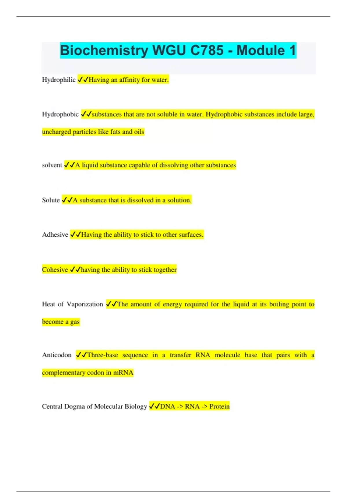 Biochemistry WGU C785 - Module 1 Hydrophilic Having an affinity for water. Hydrophobic substances that are not soluble in water. Hydrophobic substances include large, uncharged particles like fats and oils solvent A liquid substance capable of dissolving other substances Solute A substance that is dissolved in a solution. Adhesive Having the ability to stick to other surfaces. Cohesive having the ability to stick together Heat of Vaporization The amount of energy required for the liquid at its boiling point to become a gas Anticodon Three-base sequence in a transfer RNA molecule base that pairs with a complementary codon in mRNA Central Dogma of Molecular Biology DNA -> RNA -> ProteinThis paradigm was formulated by Grancis Crick: First, a portion of the DNA, a gene, is transcribed to produce a complementary strand of RNA; then RNA is translated into protein Codon A specific sequence of three adjacent bases on a strand of DNA or RNA that provides genetic code information for a particular amino acid DNA deoxyribonucleic acid, a self-replicating material present in nearly all living organisms as the main constituent of chromosomes. It is the carrier of genetic information. Dominant Allele an allele that dominates or masks the presence of another allele and is fully expressed Dominant trait the trait that is expressed from a dominant allele Recessive allele the trait that is completely masked and is not expressed