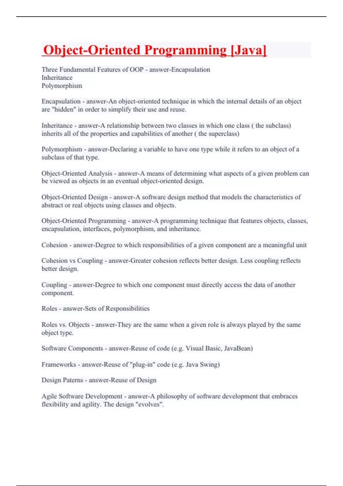 Java OOP Object Oriented Programming - answer-A type of programming that focuses on objects Inheritance - answer-A class derives non-private properties or method from an existing class Polymorphism - answer-Subclass that can be though as its superclass Encapsulation - answer-Protects variables or methods from being accessed outside its desired scope Dynamic Blinding - answer-Looking up variables or methods in the upper levels of a family tree Constructor Chaining - answer-A chain of calls from a subclass to same class of higher and higher superclass Concrete class - answer-regular class abstract class - answer-class that contain abstract methods wrapper class - answer-class that makes an object type from primitive type inner class - answer-class define within a class sub class - answer-class derives non-private properties or methods from existing class super class - answer-Class derived by another class class - answer-define an object this - answer-to differentiate b/w class variable and local variable ;refer to another constructor new - answer-create instance of object static - answer-indicates shared variables or methods package visibility - answer-private,public,default,protected super - answer-differentiate b/w superclass properties or methods from subclass default super - answer-super() is called automatically when no call to super default constructor - answer-className(){ } called automatically when there is no constructor extends - answer-define inheritance relation b/w 2 classes implements - answer-define inheritance b/w class and interface abstract - answer-define abstract class that may contain abstract method; can be used in front of method to indicate that it is abstract (no definition) abstract method - answer-method that have no specific content interface - answer-class like-structure that contain only abstract method