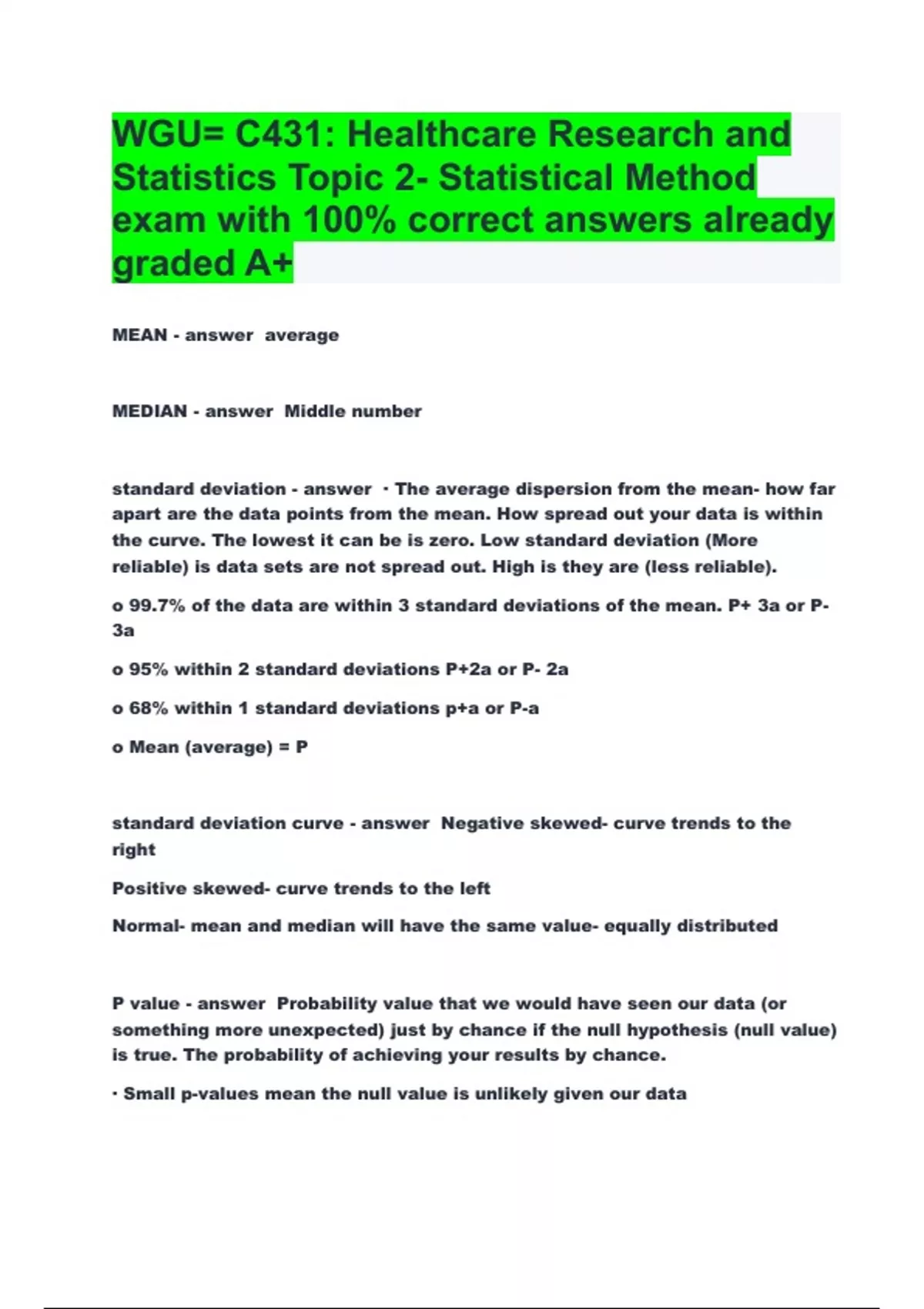 WGU= C431: Healthcare Research and Statistics Topic 2- Statistical Method exam with 100% correct answers already graded A+