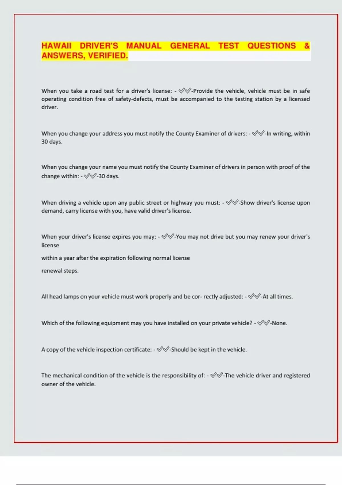HAWAII DRIVER'S MANUAL GENERAL TEST QUESTIONS & ANSWERS, VERIFIED. When you take a road test for a driver's license: - -Provide the vehicle, vehicle must be in safe operating condition free of safety-defects, must be accompanied to the testing station by a licensed driver. When you change your address you must notify the County Examiner of drivers: - -In writing, within 30 days. When you change your name you must notify the County Examiner of drivers in person with proof of the change within: - -30 days. When driving a vehicle upon any public street or highway you must: - -Show driver's license upon demand, carry license with you, have valid driver's license. When your driver's license expires you may: - -You may not drive but you may renew your driver's license within a year after the expiration following normal license