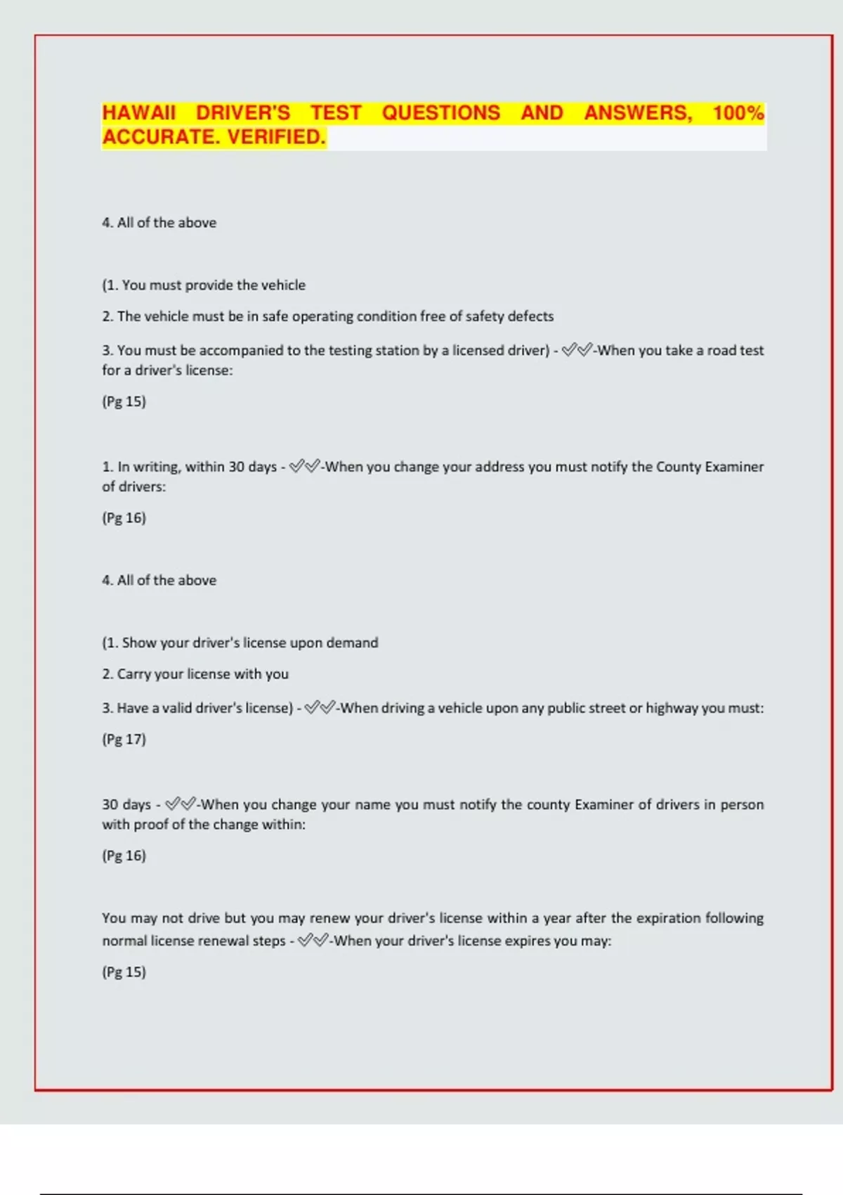HAWAII DRIVER'S TEST QUESTIONS AND ANSWERS, 100% ACCURATE. VERIFIED. 4. All of the above (1. You must provide the vehicle 2. The vehicle must be in safe operating condition free of safety defects 3. You must be accompanied to the testing station by a licensed driver) - -When you take a road test for a driver's license: (Pg 15) 1. In writing, within 30 days - -When you change your address you must notify the County Examiner of drivers: (Pg 16) 4. All of the above (1. Show your driver's license upon demand 2. Carry your license with you 3. Have a valid driver's license) - -When driving a vehicle upon any public street or highway you must: (Pg 17) 30 days - -When you change your name you must notify the county Examiner of drivers in person with proof of the change within: (Pg 16) You may not drive but you may renew your driver's license within a year after the expiration following normal license renewal steps - -When your driver's license expires you may: (Pg 15) At all times - -All head lamps on your vehicle must work properly and be correctly adjusted: (Pg 20) None of the above - -Which of the following equipment may you have installed on your private vehicle? (Pg 18) Should be kept in the vehicle - -A copy of the vehicle inspection certificate