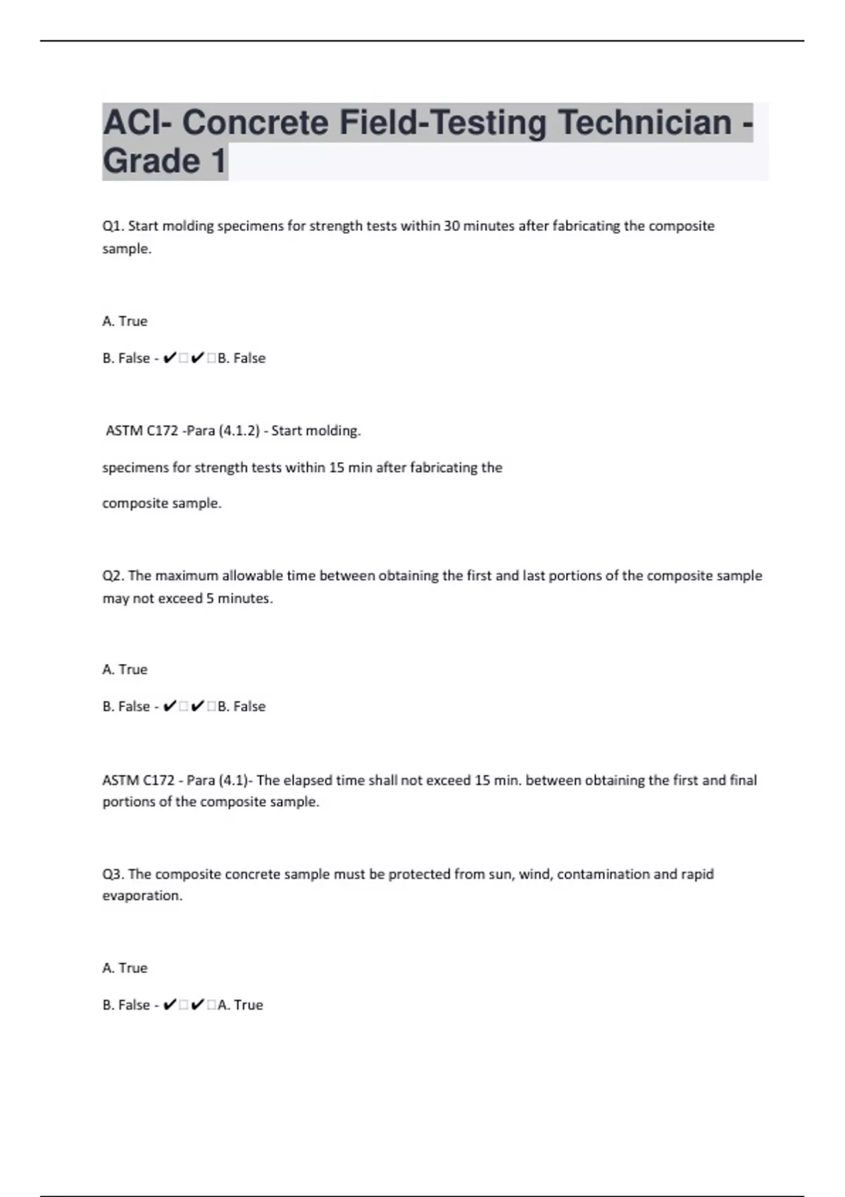 Q1. Start molding specimens for strength tests within 30 minutes after fabricating the composite sample. A. True B. False - ️️B. False ASTM C172 -Para (4.1.2) - Start molding. specimens for strength tests within 15 min after fabricating the composite sample. Q2. The maximum allowable time between obtaining the first and last portions of the composite sample may not exceed 5 minutes. A. True B. False - ️️B. False ASTM C172 - Para (4.1)- The elapsed time shall not exceed 15 min. between obtaining the first and final portions of the composite sample. Q3. The composite concrete sample must be protected from sun, wind, contamination and rapid evaporation. A. True B. False - ️️A. True
