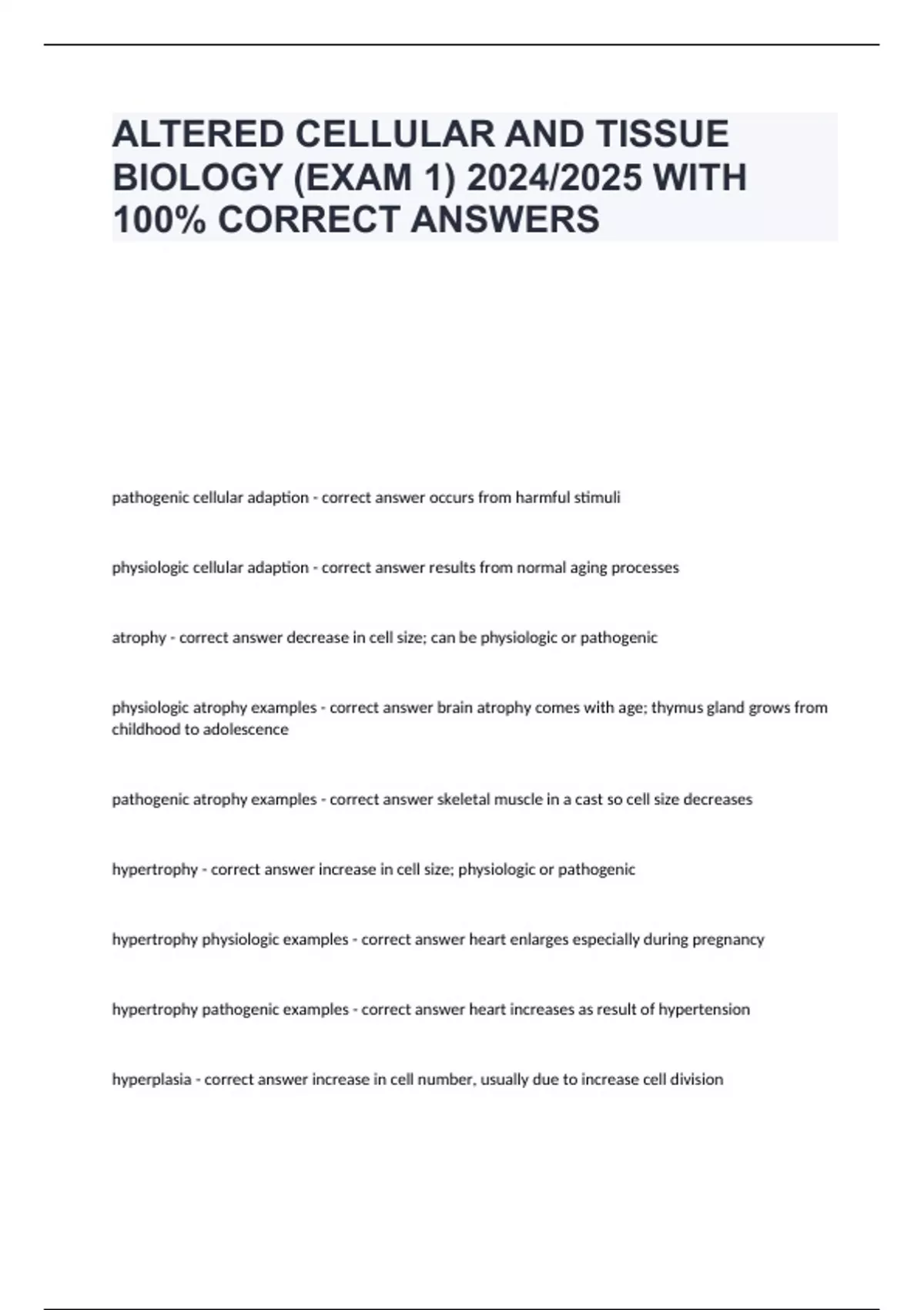 pathogenic cellular adaption - correct answer occurs from harmful stimuli physiologic cellular adaption - correct answer results from normal aging processes atrophy - correct answer decrease in cell size; can be physiologic or pathogenic physiologic atrophy examples - correct answer brain atrophy comes with age; thymus gland grows from childhood to adolescence pathogenic atrophy examples - correct answer skeletal muscle in a cast so cell size decreases hypertrophy - correct answer increase in cell size; physiologic or pathogenic hypertrophy physiologic examples - correct answer heart enlarges especially during pregnancy hypertrophy pathogenic examples - correct answer heart increases as result of hypertension hyperplasia - correct answer increase in cell number, usually due to increase cell division hyperplasia physiologic examples - correct answer breast tissue development during puberty hyperplasia pathogenic examples - correct answer hyperplasia of prostate gland dysplasia - correct answer abnormal adaption and disorganized cells; variety of cell shapes, size, and organization of cells; no physiologic dysplasia pathogenic examples - correct answer mostly in relation with cancer metaplasia - correct answer replacement of one cell types with another; no physiologic metaplasia pathogenic examples - correct answer respiratory cells of smokers cellular injury - correct answer under stress, cells adapt; however, adaption may not be enough and cells can be injured; mild injuries can be reversible, but irreversible injuries can lead to cell death hypoxic injury - correct answer lack of oxygen to tissues; most common cause of cellular injury gradual hypoxic injury - correct answer ischemia; plaque buildup and less oxygen flow sudden hypoxic injury - correct answer anoxia; caused by blood clot or thrombus reperfusion injury - correct answer byproducts of anaerobic metabolism flow back into blood and can end up in reperfusion injury oxidative stress - correct answer a condition in which the production of oxidants and free radicals exceeds the body's ability to handle them and prevent damage free radicals - correct answer electrically uncharged atoms or groups of atoms with an unpaired electron and makes molecules unstable unpaired electron damage - correct answer lipid per oxidation, alteration of proteins, alteration of DNA (mutations), damage to mitochondria chemical injuries - correct answer direct damage (on cells), exaggerated response (overdose), biologic activation to toxic metabolites, hypersensitivities and related immunologic reactions (allergic reactions, immediate or delayed) biologic activation to toxic metabolites - correct answer drugs/chemicals are broken down in body and have toxic parts, which then tax certain body parts lead (Pb) chemical injury - correct answer crosses the blood brain barrier and causes neural complications carbon monoxide (CO) chemical injury - correct answer CO binds to hemoglobin and kicks oxygen out of system ethanol (C2H6O) chemical injury - correct answer alcohol; neural depressant that causes neural delays mercury (Hg) chemical injury - correct answer CNS depressant that causes neural impairment asphyxial injury - correct answer similar to hypoxic injuries (unable to use enough oxygen); suffocation, strangulation, chemical asphyxiants, drowning chemical asphyxiants - correct answer something binds to hemoglobin better than oxygen; carbon monoxide is example contusion - correct answer bruises; blunt force injuries that cause micro bursting of capillaries hematoma - correct answer blood clot that forms under the skin abrasion - correct answer scratches or rash; removes a couple layers of skin