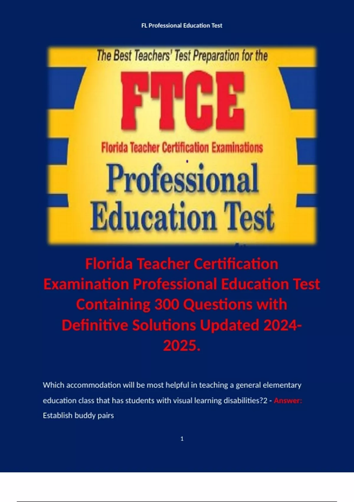 Florida Teacher Certification Examination Professional Education Test Containing 300 Questions with Definitive Solutions Updated . Terms like: Which accommodation will be most helpful in teaching a general elementary education class that has students with visual learning disabilities? 2 - Answer: Establish buddy pairs
