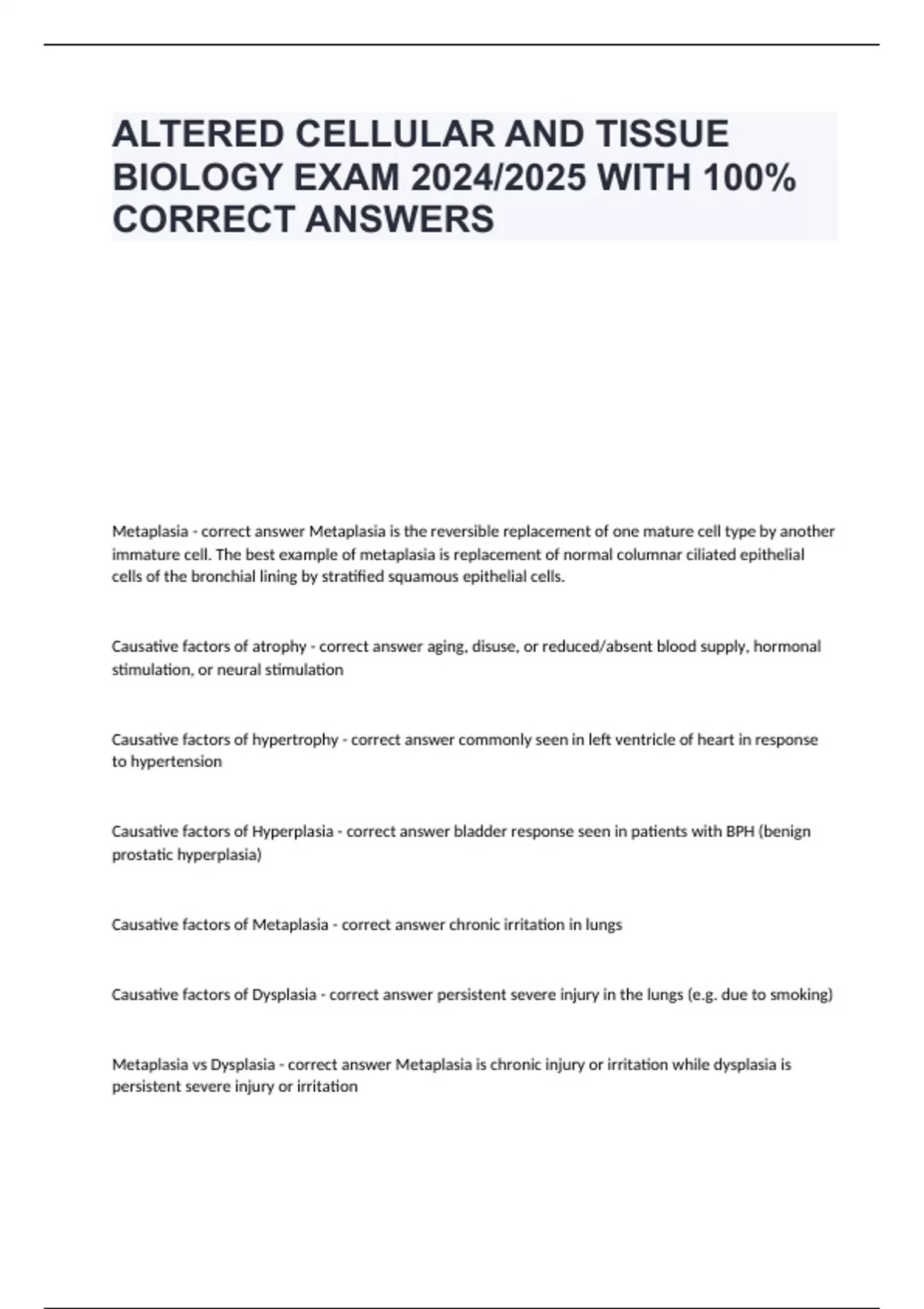 Metaplasia - correct answer Metaplasia is the reversible replacement of one mature cell type by another immature cell. The best example of metaplasia is replacement of normal columnar ciliated epithelial cells of the bronchial lining by stratified squamous epithelial cells. Causative factors of atrophy - correct answer aging, disuse, or reduced/absent blood supply, hormonal stimulation, or neural stimulation Causative factors of hypertrophy - correct answer commonly seen in left ventricle of heart in response to hypertension Causative factors of Hyperplasia - correct answer bladder response seen in patients with BPH (benign prostatic hyperplasia) Causative factors of Metaplasia - correct answer chronic irritation in lungs Causative factors of Dysplasia - correct answer persistent severe injury in the lungs (e.g. due to smoking) Metaplasia vs Dysplasia - correct answer Metaplasia is chronic injury or irritation while dysplasia is persistent severe injury or irritation What is the most common cause of cellular injury? - correct answer hypoxia Describe the mechanism of cellular injury that can occur as a result of the following causes: hypoxia, free radicals, and reactive oxygen species. - correct answer hypoxia can lead to inflammation OR that the opposite can be true - inflammation can lead to hypoxia Reversible vs. Irreversible injury - correct answer The normal cell responds to physiologic and pathologic stresses by adapting (atrophy, hypertrophy, hyperplasia, metaplasia). Cell injury occurs if the adaptive responses are exceeded or compromised by injurious agents, stress, and mutations. The injury is reversible if it is mild or transient, but if the stimulus persists the cell suffers irreversible injury and eventually death. Reperfusion Injury - correct answer Without oxygen, or anoxia, the cells display hypoxic injury and become swollen. With reoxygenation, reperfusion injury increases because of the formation of reactive oxygen radicals that can cause cell necrosis. Antioxidant mechanisms - correct answer Generation of Reactive Oxygen Species and Antioxidant Mechanisms in Biologic Systems. The three reactive oxygen species cause free radical damage to lipids (peroxidation of the membrane), proteins (ion pump damage), and DNA (impaired protein synthesis). The major antioxidant enzymes include superoxide dismutase, catalase, and glutathione peroxidase. Contusion - correct answer bleeding into tissues after a trauma Abrasions - correct answer scrapes Laceration - correct answer tearing of skin Hematoma - correct answer subdural (beween brain and dura), epidural (between skull and dura) Significant Adaptive Stages of Cells - correct answer -Atrophy -hypertrophy -hyperplasia -metaplasia What causes Atrophy? - correct answer decrease in cellular size caused by aging, disuse or lack of blood supply, hormonal stimulation, or neural stimulation. What causes hypertrophy? - correct answer -increase work demands or hormonal stimulation -commonly seen in left ventricle of heart in response to hypertension Hyperplasia - correct answer -increased rate of cellular division -bladder response seen in patients with BPH (benign prostatic hyperplasia) -normal hyperplasia is stimulated when we need to replace lost tissue Metaplasia - correct answer reversible replacement of one mature cell type by another less mature cell -chronic irritation in lungs Dysplasia - correct answer abnormal change in size, shape, and organization of mature cell. -severe injury in the lungs due to smoking -persistent or severe injury or irritation Hypoxia can lead to inflammation in... - correct answer -pulmonary edema -Cancer -Organ transplantation -Adipose tissue Inflammation can lead to hypoxia in... - correct answer -acute lung injury -colitis -infections with pathogens Reperfusion injury - correct answer restoration of oxygen can