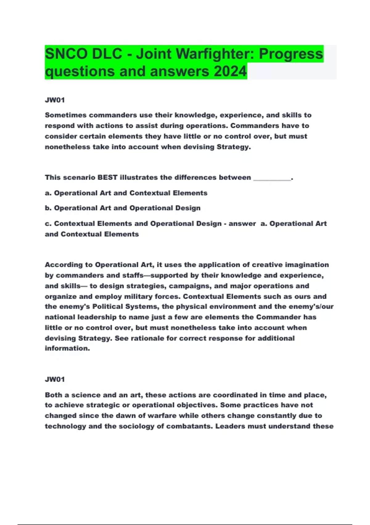 SNCO DLC - Joint Warfighter: Progress questions and answers 2024