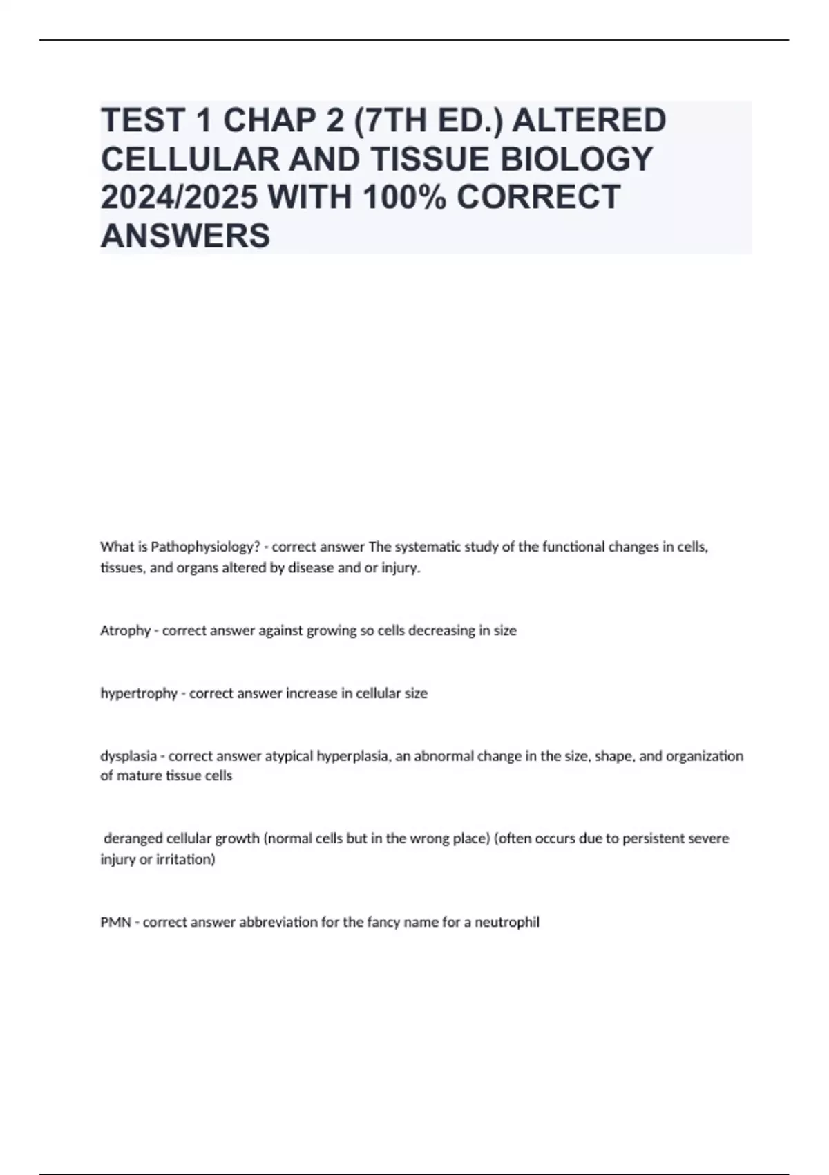 Ace Your Exams with Our Comprehensive Exam Documents and Answers! Struggling with exam preparation? Look no further! Our expertly crafted exam documents come complete with accurate answers, helping you study efficiently and effectively. Each document is designed to cover key topics, provide clear explanations, and offer insightful answers to typical exam questions. Perfect for students aiming to excel, our materials are regularly updated to align with the latest curriculum standards. **Why Choose Us?** - Accurate and Reliable: Verified answers you can trust. - Comprehensive Coverage: Detailed documents covering all major topics. - Time-Saving: Study smarter, not harder. - User-Friendly Format: Easy to navigate and understand. Achieve academic success with our top-notch study aids. Get started today and ace your exams with confidence! Feel free to modify it to better fit your specific offerings!