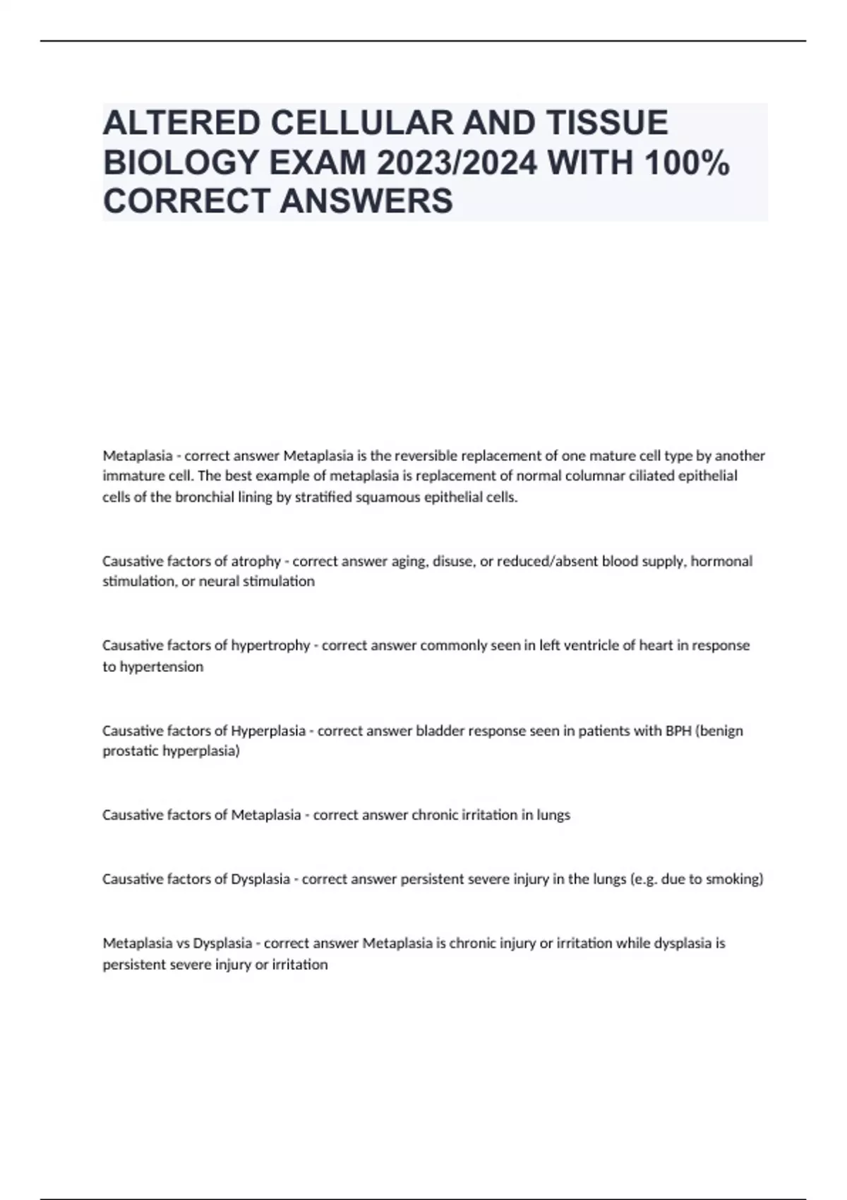 Metaplasia - correct answer Metaplasia is the reversible replacement of one mature cell type by another immature cell. The best example of metaplasia is replacement of normal columnar ciliated epithelial cells of the bronchial lining by stratified squamous epithelial cells. Causative factors of atrophy - correct answer aging, disuse, or reduced/absent blood supply, hormonal stimulation, or neural stimulation Causative factors of hypertrophy - correct answer commonly seen in left ventricle of heart in response to hypertension Causative factors of Hyperplasia - correct answer bladder response seen in patients with BPH (benign prostatic hyperplasia) Causative factors of Metaplasia - correct answer chronic irritation in lungs Causative factors of Dysplasia - correct answer persistent severe injury in the lungs (e.g. due to smoking) Metaplasia vs Dysplasia - correct answer Metaplasia is chronic injury or irritation while dysplasia is persistent severe injury or irritation What is the most common cause of cellular injury? - correct answer hypoxia Describe the mechanism of cellular injury that can occur as a result of the following causes: hypoxia, free radicals, and reactive oxygen species. - correct answer hypoxia can lead to inflammation OR that the opposite can be true - inflammation can lead to hypoxia Reversible vs. Irreversible injury - correct answer The normal cell responds to physiologic and pathologic stresses by adapting (atrophy, hypertrophy, hyperplasia, metaplasia). Cell injury occurs if the adaptive responses are exceeded or compromised by injurious agents, stress, and mutations. The injury is reversible if it is mild or transient, but if the stimulus persists the cell suffers irreversible injury and eventually death. Reperfusion Injury - correct answer Without oxygen, or anoxia, the cells display hypoxic injury and become swollen. With reoxygenation, reperfusion injury increases because of the formation of reactive oxygen radicals that can cause cell necrosis. Antioxidant mechanisms - correct answer Generation of Reactive Oxygen Species and Antioxidant Mechanisms in Biologic Systems. The three reactive oxygen species cause free radical damage to lipids (peroxidation of the membrane), proteins (ion pump damage), and DNA (impaired protein synthesis). The major antioxidant enzymes include superoxide dismutase, catalase, and glutathione peroxidase. Contusion - correct answer bleeding into tissues after a trauma Abrasions - correct answer scrapes Laceration - correct answer tearing of skin Hematoma - correct answer subdural (beween brain and dura), epidural (between skull and dura) Significant Adaptive Stages of Cells - correct answer -Atrophy -hypertrophy -hyperplasia -metaplasia What causes Atrophy? - correct answer decrease in cellular size caused by aging, disuse or lack of blood supply, hormonal stimulation, or neural stimulation. What causes hypertrophy? - correct answer -increase work demands or hormonal stimulation -commonly seen in left ventricle of heart in response to hypertension Hyperplasia - correct answer -increased rate of cellular division -bladder response seen in patients with BPH (benign prostatic hyperplasia) -normal hyperplasia is stimulated when we need to replace lost tissue Metaplasia - correct answer reversible replacement of one mature cell type by another less mature cell -chronic irritation in lungs Dysplasia - correct answer abnormal change in size, shape, and organization of mature cell. -severe injury in the lungs due to smoking -persistent or severe injury or irritation Hypoxia can lead to inflammation in... - correct answer -pulmonary edema -Cancer -Organ transplantation -Adipose tissue Inflammation can lead to hypoxia in... - correct answer -acute lung injury -colitis -infections with pathogens