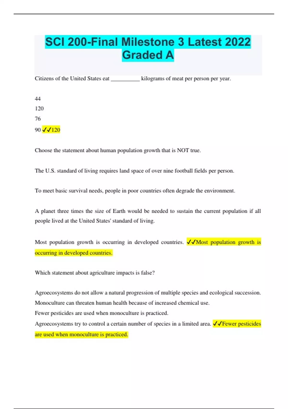 SCI 200-Final Milestone 3 Latest Graded A Citizens of the United States eat __________ kilograms of meat per person per year. 44 120 76 90 120 Choose the statement about human population growth that is NOT true. The U.S. standard of living requires land space of over nine football fields per person. To meet basic survival needs, people in poor countries often degrade the environment. A planet three times the size of Earth would be needed to sustain the current population if all people lived at the United States' standard of living. Most population growth is occurring in developed countries. Most population growth is occurring in developed countries. Which statement about agriculture impacts is false? Agroecosystems do not allow a natural progression of multiple species and ecological succession. Monoculture can threaten human health because of increased chemical use. Fewer pesticides are used when monoculture is practiced. Agroecosystems try to control a certain number of species in a limited area. Fewer pesticides are used when monoculture is practiced.Which statement describes the environmental impact of developing countries? Individuals in these countries have to degrade the environment to meet basic needs. Individuals in these countries benefit from efficient food distribution systems. These countries rely on technology to improve crops and food production. These countries leave the largest ecological footprint. Individuals in these countries have to degrade the environment to meet basic needs. When Connie makes potato salad, she always puts the potato peels in the garden. Which waste disposal method is Connie practicing? Recycle Reuse Landfill Compost Compost Lillian always locks the cupboard in which she keeps the chemicals for the swimming pool. She has a curious four-year-old and she knows he wouldn't recognize the pretty colored vials as poison. One day, the pool maintenance person returned to his truck for a moment, and Lillian saw her dog sniffing at the open cupboard. Quickly, Lillian called the dog to her side and she scolded the maintenance person for leaving the open cupboard unattended. Lillian is most concerned about the which of the following