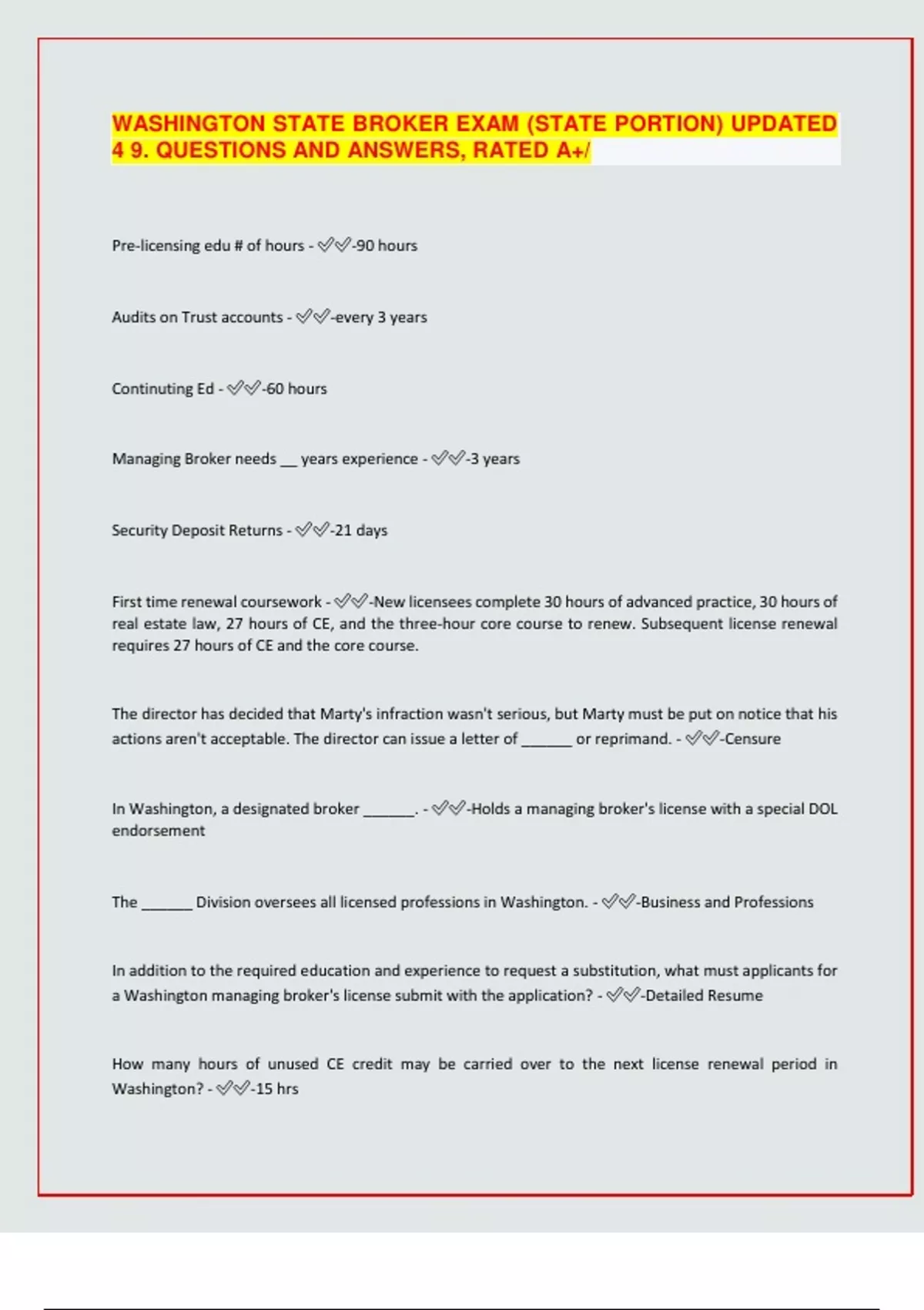 WASHINGTON STATE BROKER EXAM (STATE PORTION) UPDATED 4 9. QUESTIONS AND ANSWERS, RATED A+/ Pre-licensing edu # of hours - -90 hours Audits on Trust accounts - -every 3 years Continuting Ed - -60 hours Managing Broker needs __ years experience - -3 years Security Deposit Returns - -21 days First time renewal coursework - -New licensees complete 30 hours of advanced practice, 30 hours of real estate law, 27 hours of CE, and the three-hour core course to renew. Subsequent license renewal requires 27 hours of CE and the core course. The director has decided that Marty's infraction wasn't serious, but Marty must be put on notice that his actions aren't acceptable. The director can issue a letter of ______ or reprimand. - -Censure In Washington, a designated broker ______. - -Holds a managing broker's license with a special DOL endorsement The ______ Division oversees all licensed professions in Washington. - -Business and Professions In addition to the required education and experience to request a substitution, what must applicants for a Washington managing broker's license submit with the application? - -Detailed Resume How many hours of unused CE credit may be carried over to th