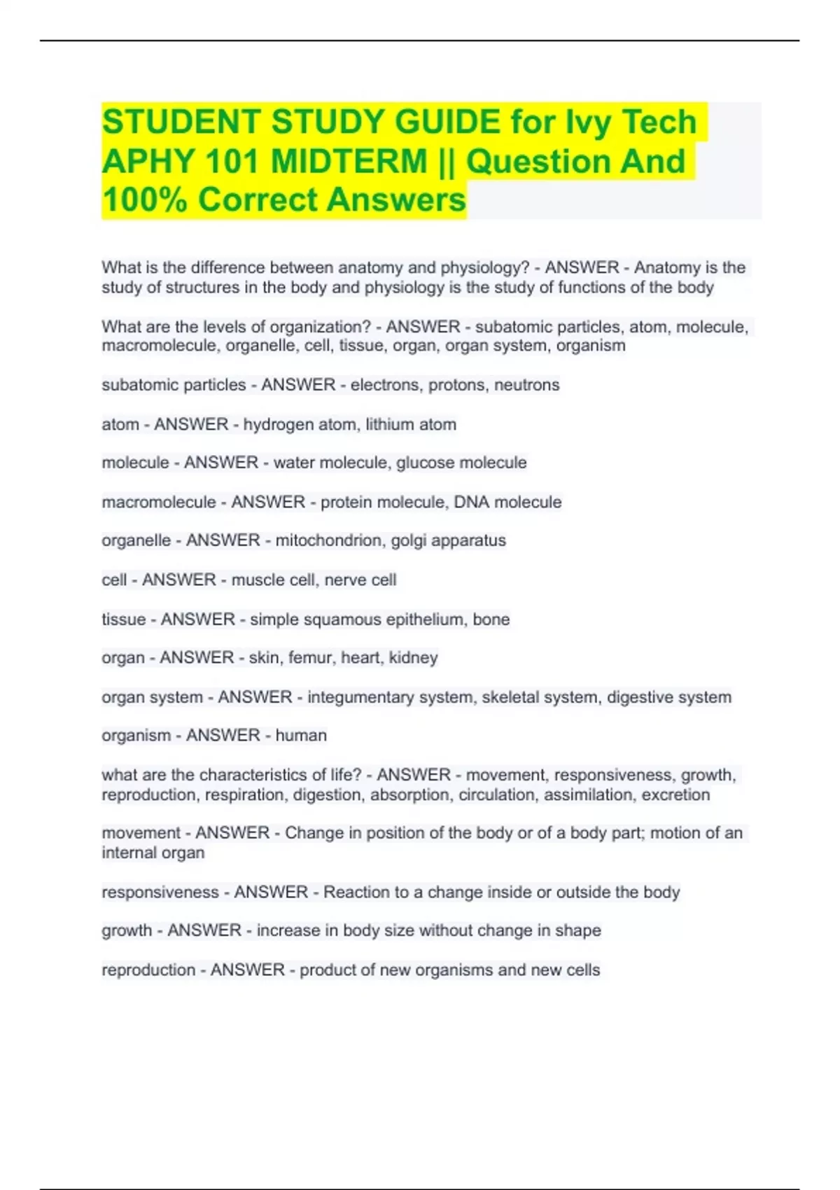 STUDENT STUDY GUIDE for Ivy Tech APHY 101 MIDTERM || Question And 100% Correct Answers STUDENT STUDY GUIDE for Ivy Tech APHY 101 MIDTERM || Question And 100% Correct Answers STUDENT STUDY GUIDE for Ivy Tech APHY 101 MIDTERM || Question And 100% Correct Answers STUDENT STUDY GUIDE for Ivy Tech APHY 101 MIDTERM || Question And 100% Correct Answers What is the difference between anatomy and physiology? - ANSWER - Anatomy is the study of structures in the body and physiology is the study of functions of the body What are the levels of organization? - ANSWER - subatomic particles, atom, molecule, macromolecule, organelle, cell, tissue, organ, organ system, organism subatomic particles - ANSWER - electrons, protons, neutrons