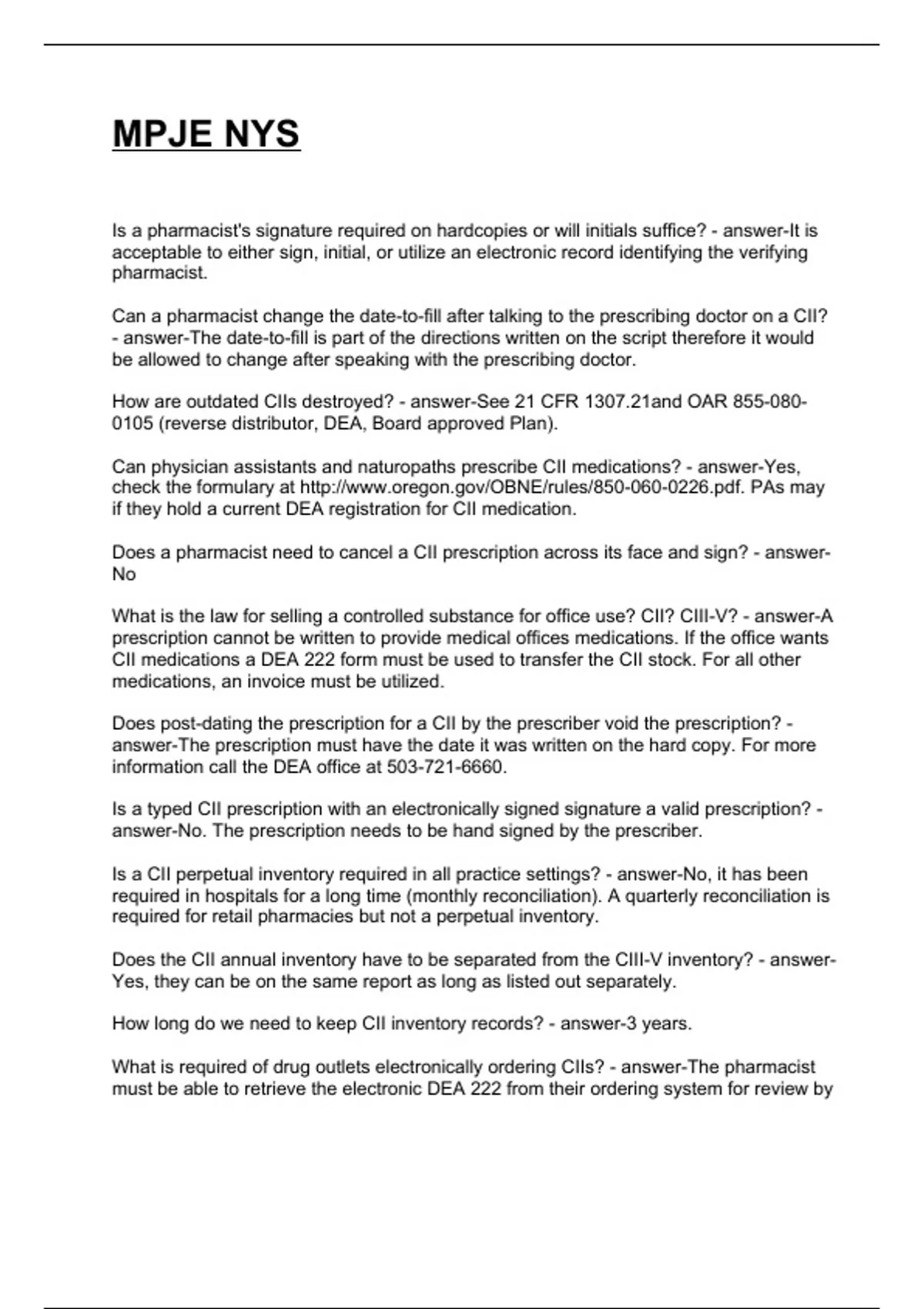 Is a pharmacist's signature required on hardcopies or will initials suffice? - answer-It is acceptable to either sign, initial, or utilize an electronic record identifying the verifying pharmacist. Can a pharmacist change the date-to-fill after talking to the prescribing doctor on a CII? - answer-The date-to-fill is part of the directions written on the script therefore it would be allowed to change after speaking with the prescribing doctor. How are outdated CIIs destroyed? - answer-See 21 CFR 1307.21and OAR (reverse distributor, DEA, Board approved Plan). Can physician assistants and naturopaths prescribe CII medications? - answer-Yes, check the formulary at Does a pharmacist need to cancel a CII prescription across its face and sign? - answer-No What is the law for selling a controlled substance for office use? CII? CIII-V? - answer-A prescription cannot be written to provide medical offices medications. If the office wants CII medications a DEA 222 form must be used to transfer the CII stock. For all other medications, an invoice must be utilized. Does post-dating the prescription for a CII by the prescriber void the prescription? - answer-The prescription must have the date it was written on the hard copy. For more information call the DEA office at . Is a typed CII prescription with an electronically signed signature a valid prescription? - answer-No. The prescription needs to be hand signed by the prescriber. Is a CII perpetual inventory required in all practice settings? - answer-No, it has been required in hospitals for a long time (monthly reconciliation). A quarterly reconciliation is required for retail pharmacies but not a perpetual inventory. Does the CII annual inventory have to be separated from the CIII-V inventory? - answer-Yes, they can be on the same report as long as listed out separately. How long do we need to keep CII inventory records? - answer-3 years. What is required of drug outlets electronically ordering CIIs? - answer-The pharmacist