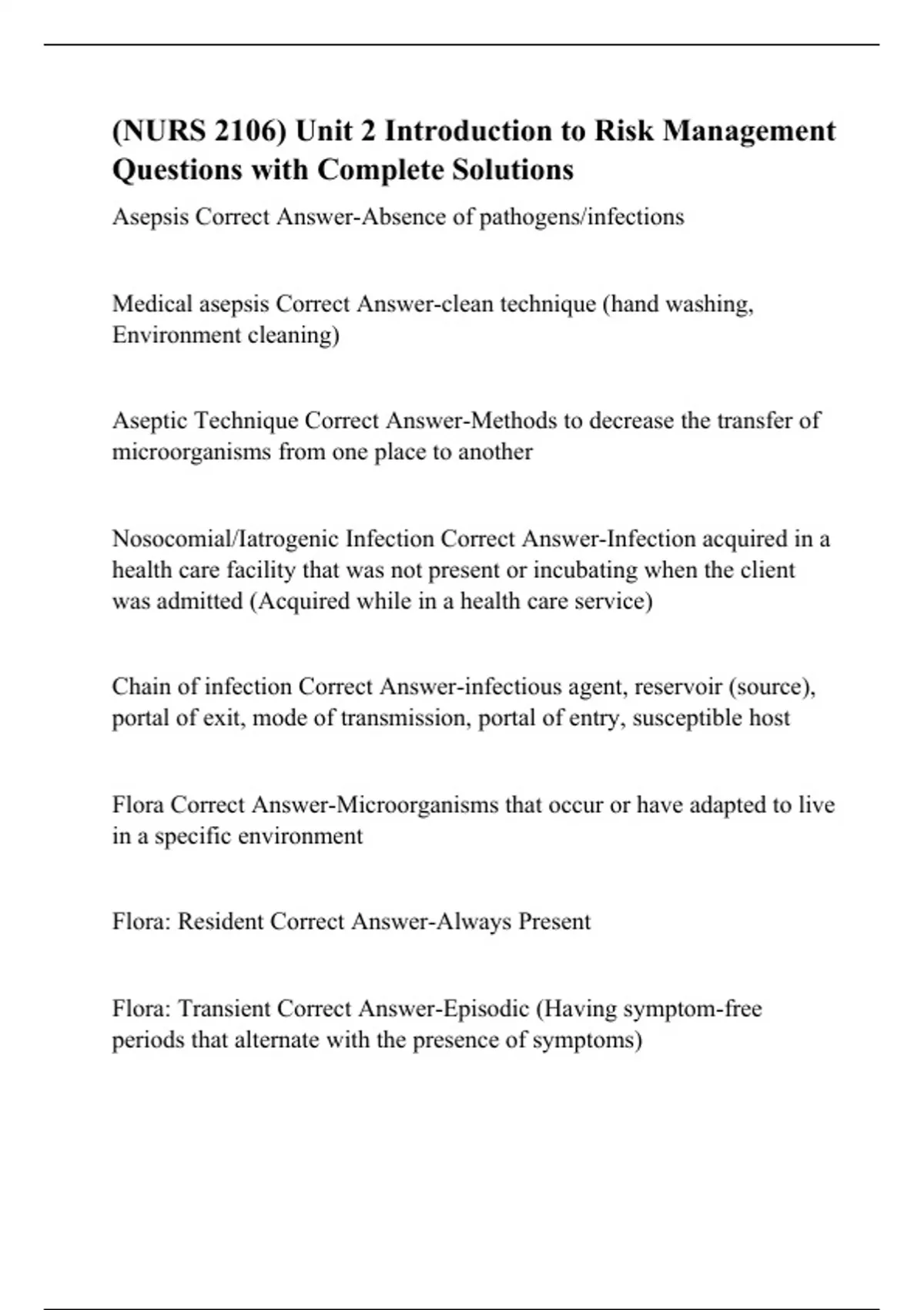 NURS 2106 Baton Rouge Community College -(NURS 2106) Unit 2 Introduction to Risk Management Questions with Complete Solutions