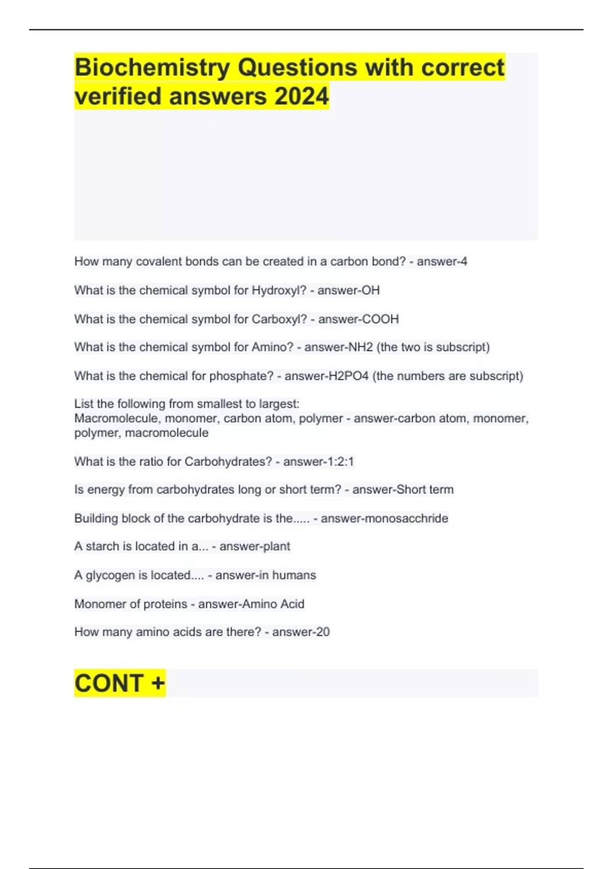 How many covalent bonds can be created in a carbon bond? - answer-4 What is the chemical symbol for Hydroxyl? - answer-OH What is the chemical symbol for Carboxyl? - answer-COOH What is the chemical symbol for Amino? - answer-NH2 (the two is subscript) What is the chemical for phosphate? - answer-H2PO4 (the numbers are subscript) List the following from smallest to largest: Macromolecule, monomer, carbon atom, polymer - answer-carbon atom, monomer, polymer, macromolecule What is the ratio for Carbohydrates? - answer-1:2:1 Is energy from carbohydrates long or short term? - answer-Short term Building block of the carbohydrate is the..... - answer-monosacchride A starch is located in a... - answer-plant A glycogen is located.... - answer-in humans Monomer of proteins - answer-Amino Acid How many amino acids are there? - answer-20 What is the main difference of the amino acids? - answer-R group Are lipids soluable in water? - answer-No Are polypeptides and proteins that same thing? - answer-Yes Give an example of a saturated fatty acid - answer-Butter Give an example of an unsaturated fatty acid - answer-Olive Oil Is wax waterproof? - answer-yes Give 2 examples of a steroid - answer-testosterone, cholesterol